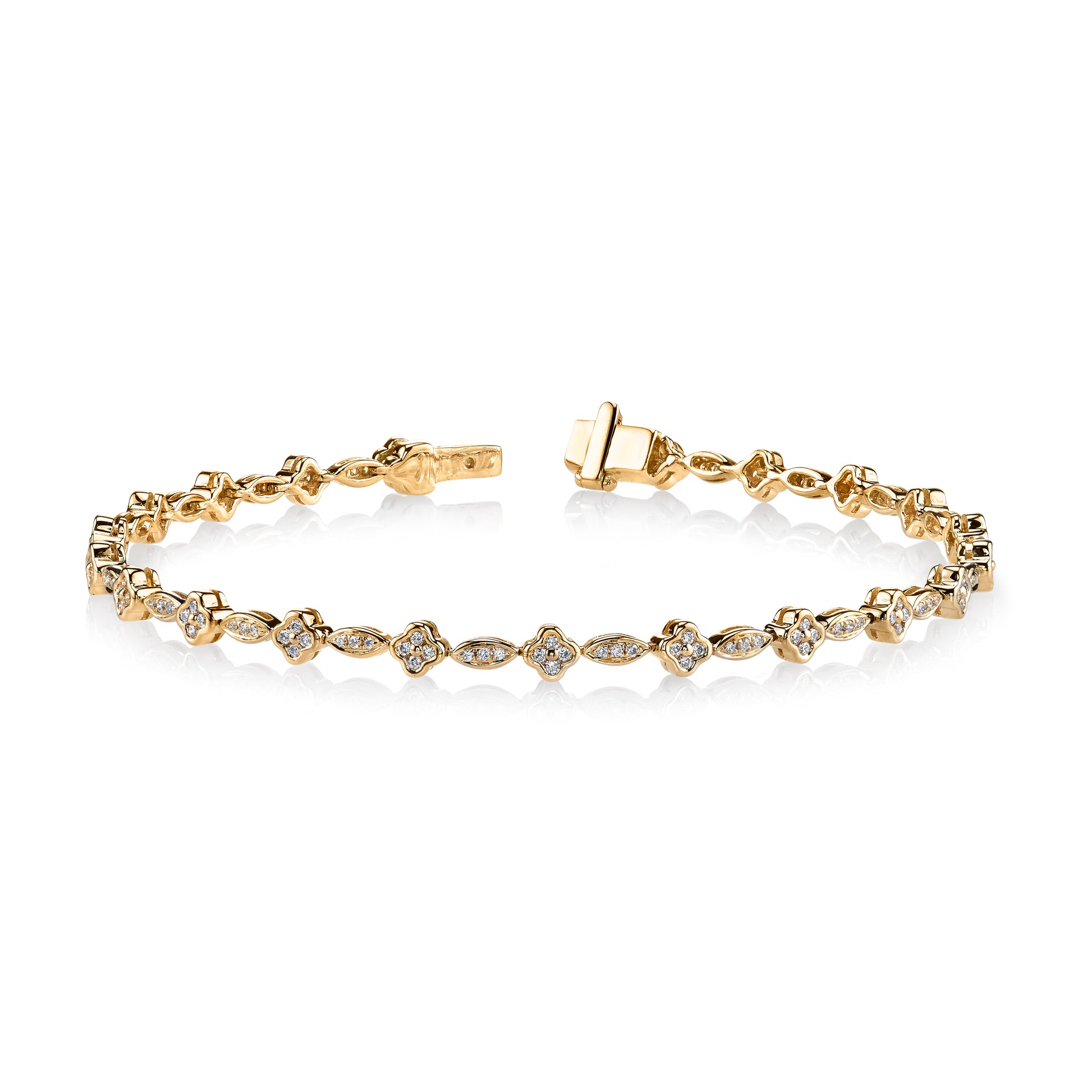 Elevate your style with this exquisite 14k Yellow Gold set with 0.65 CRT Clover Diamond Bracelet, designed to add a touch of elegance and sparkle to any outfit.
