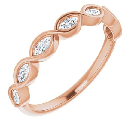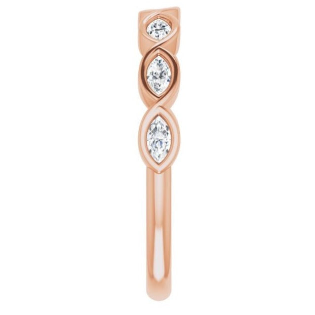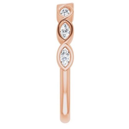 Celebrate everlasting love with our exquisite 14K Rose Approximately set with 1/3 CTW Natural Diamond Anniversary Band. The marquise shaped diamonds, each measuring 3.5 x 1.75 mm, add a touch of elegance and sparkle to this polished band. Made with 14K rose gold, this band symbolizes the timeless and enduring bond of marriage.