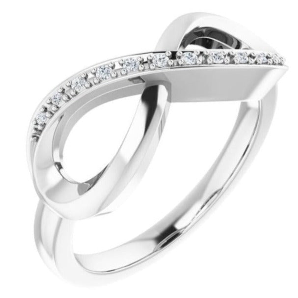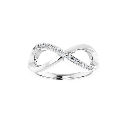 This 14K White Infinity-Inspired Ring features .05 Ctw Natural Diamonds, creating a stunning and timeless look. The infinity style symbolizes unending love, making it the perfect gift for any special occasion. Handcrafted with care, this ring is a beautiful and meaningful addition to any jewelry collection!