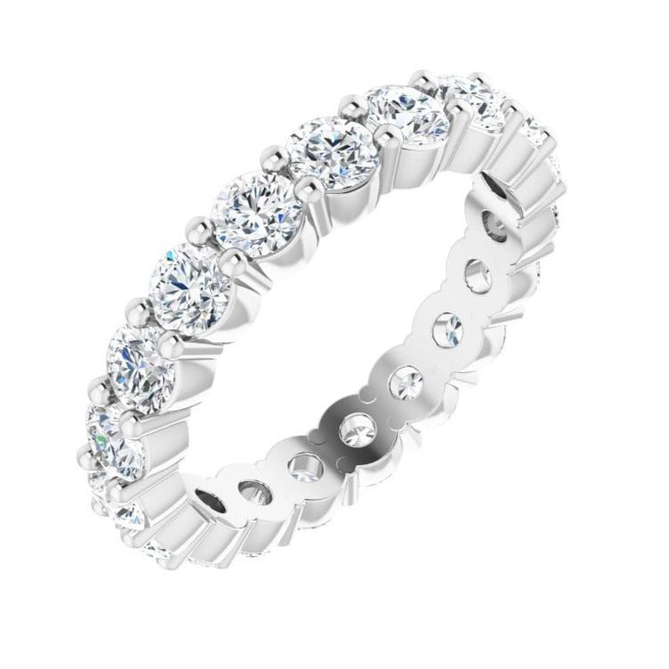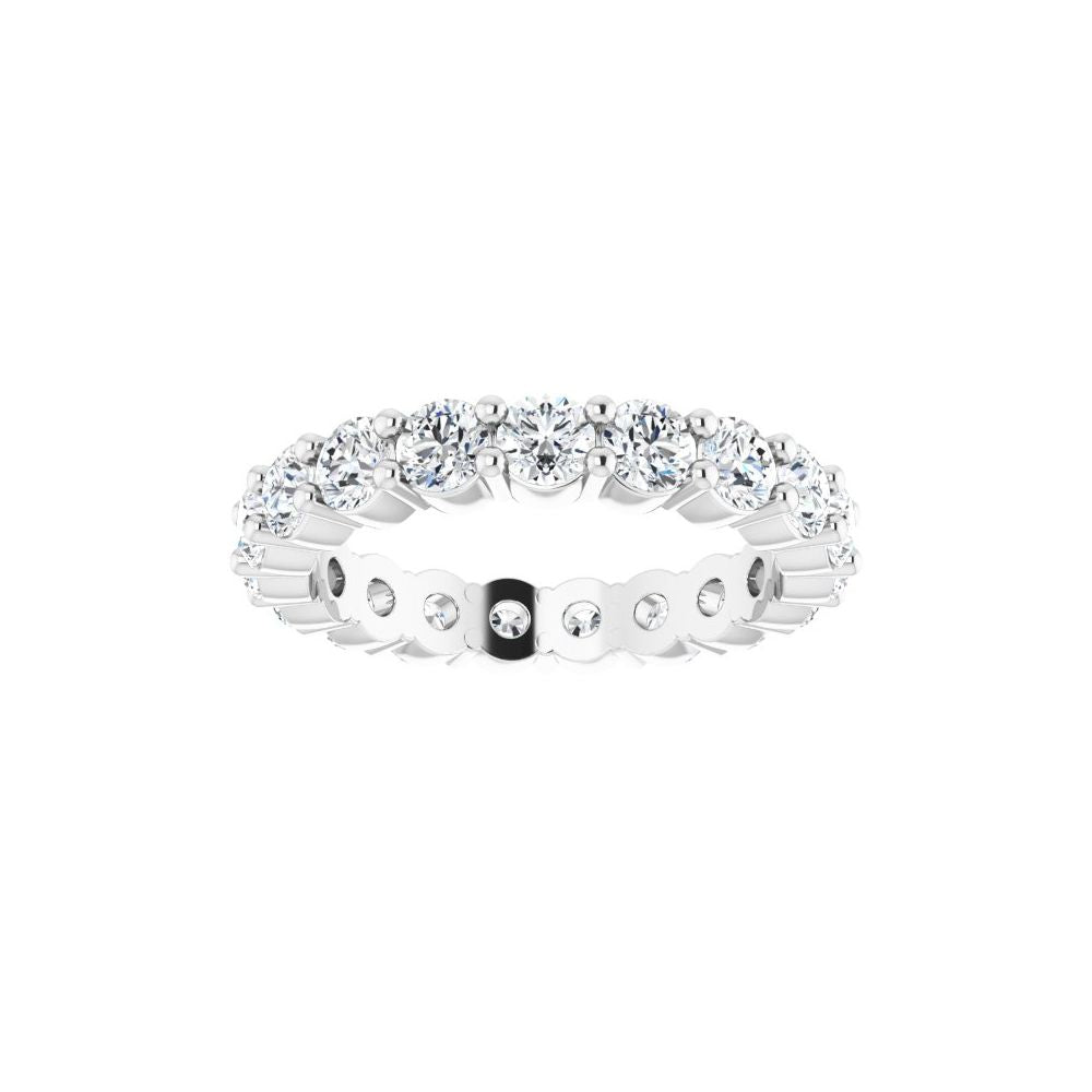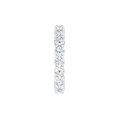 This 14K white gold eternity band features natural round diamonds totaling approximately 1 3/4 carats, varying slightly by size. With a polished finish, the 3 mm band showcases carefully selected SI2-SI3 clarity and G-H color diamonds, creating a continuous sparkle around the finger. Its elegant design offers lasting beauty and sophistication, perfect for symbolizing enduring commitment or enhancing everyday style.