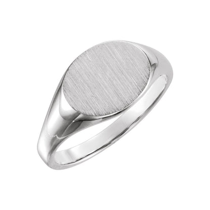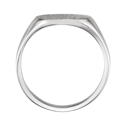 The 14K White 12.3x9.4 mm Oval Signet Ring boasts a striking blend of brushed and polished finishes, creating a truly unique and elegant piece.
