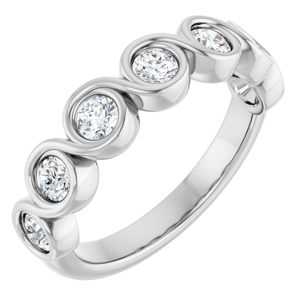 This 14K white gold anniversary band features a set of natural, round-cut diamonds totaling 3/4 carats. Each diamond is precisely 3 mm wide and polished for maximum brilliance. A perfect gift to celebrate love and years together.