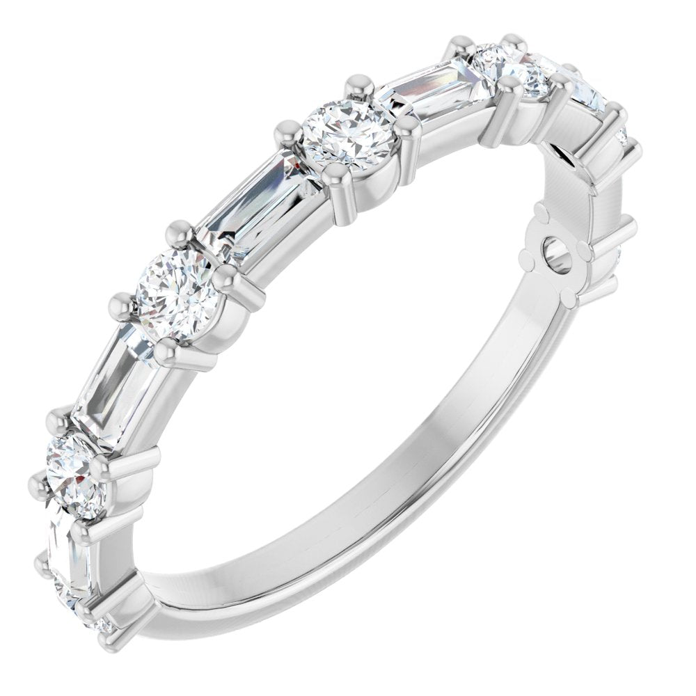 This product is a 14K white anniversary band with straight baguette natural diamonds measuring 3.5 x 1.75 mm. The band is polished and features 3/4 carats total weight of natural diamonds for a stunning and sophisticated look.