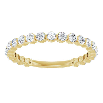 This 3/4 CTW Lab-Grown Diamond Anniversary Band is set in 14K Yellow gold and features a round cut diamond that measures 2mm in diameter. The diamond is lab-grown and polished to perfection, making it a stunning and valuable addition to any jewelry collection.