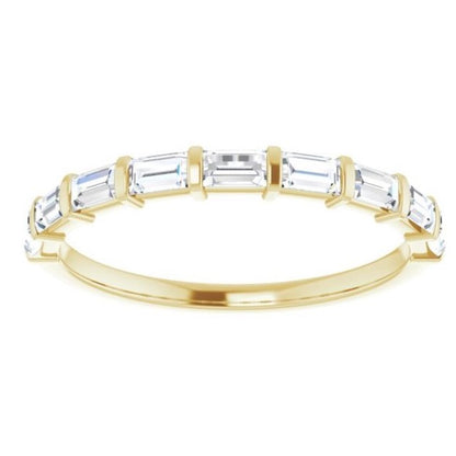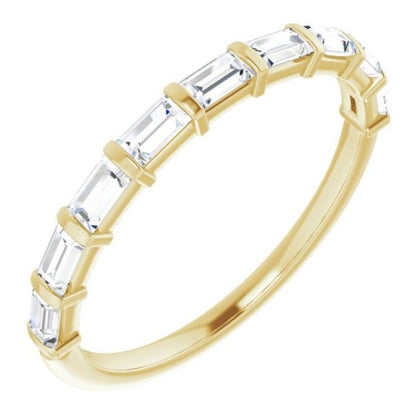 Celebrate your love with this breathtaking 14K yellow gold anniversary band, featuring natural diamonds arranged in a straight baguette pattern. The 3 x 1.5 mm diamonds are polished to perfection and approximately 3/8 carat total weight, making this an exquisite and meaningful choice to symbolize your forever commitment.
