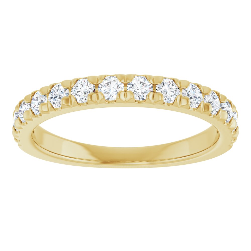 Celebrate your special moments with this polished 14K yellow gold anniversary band, featuring approximately 5/8 carats of round lab-grown diamonds set in a classic French setting. Measuring 2.25 mm wide, this elegant ring offers lasting brilliance with an ethical and modern touch.