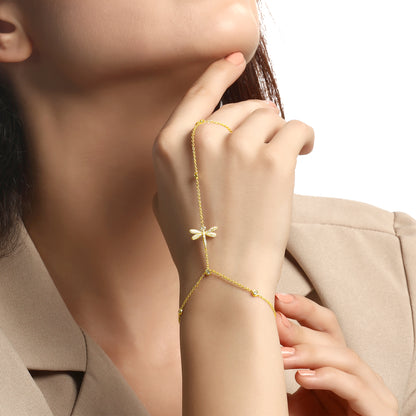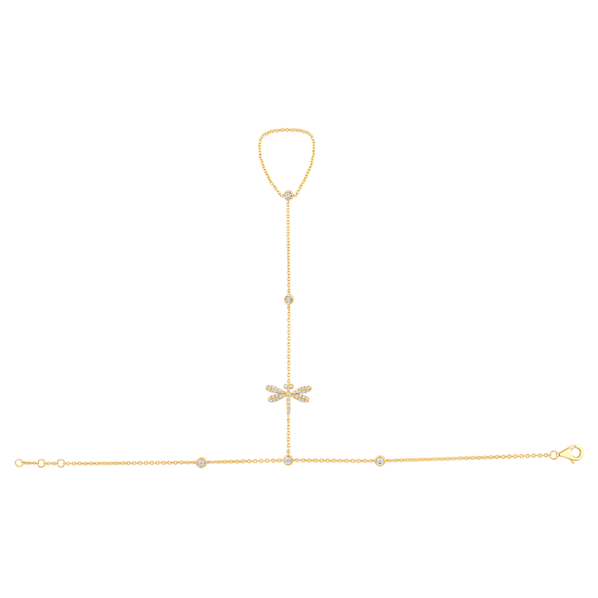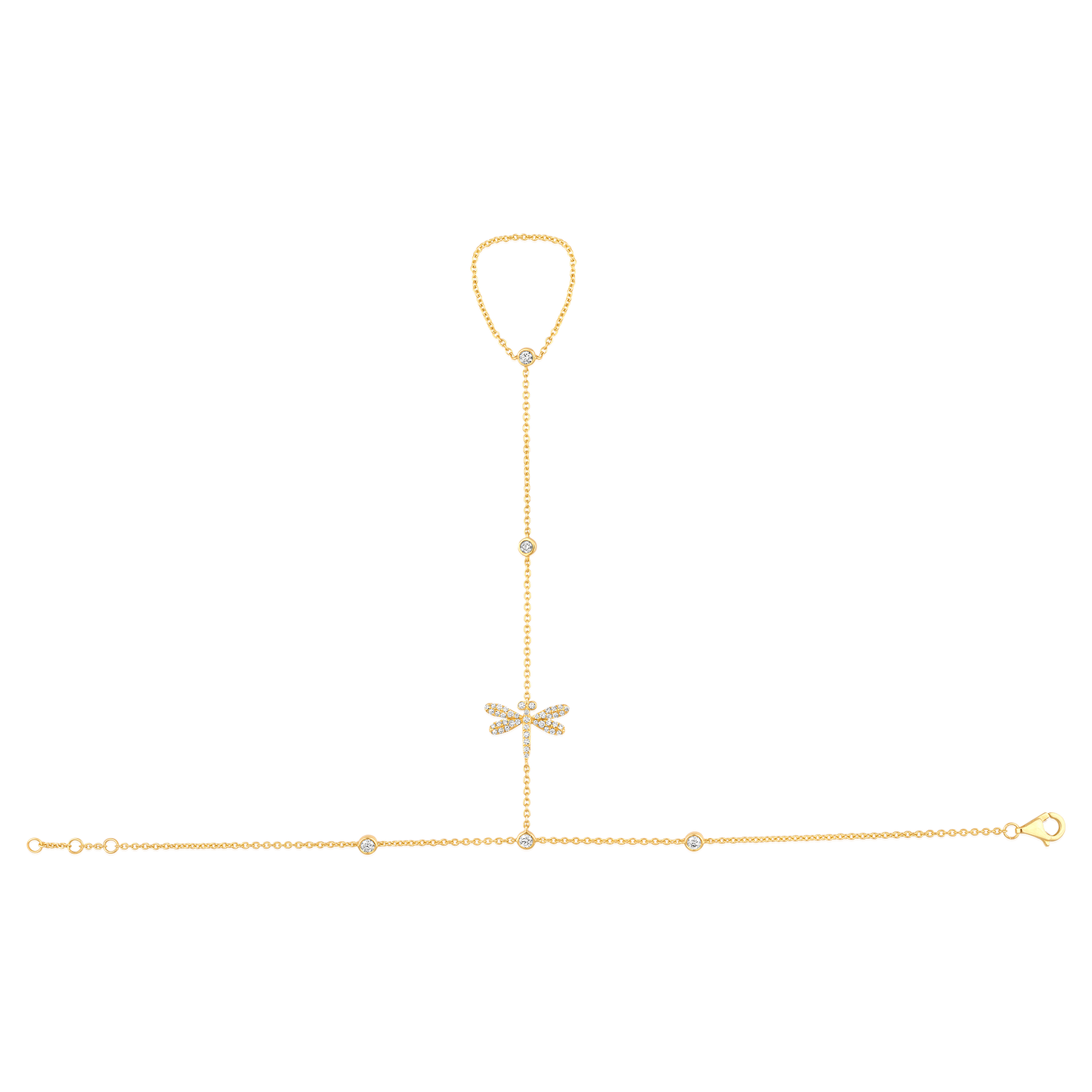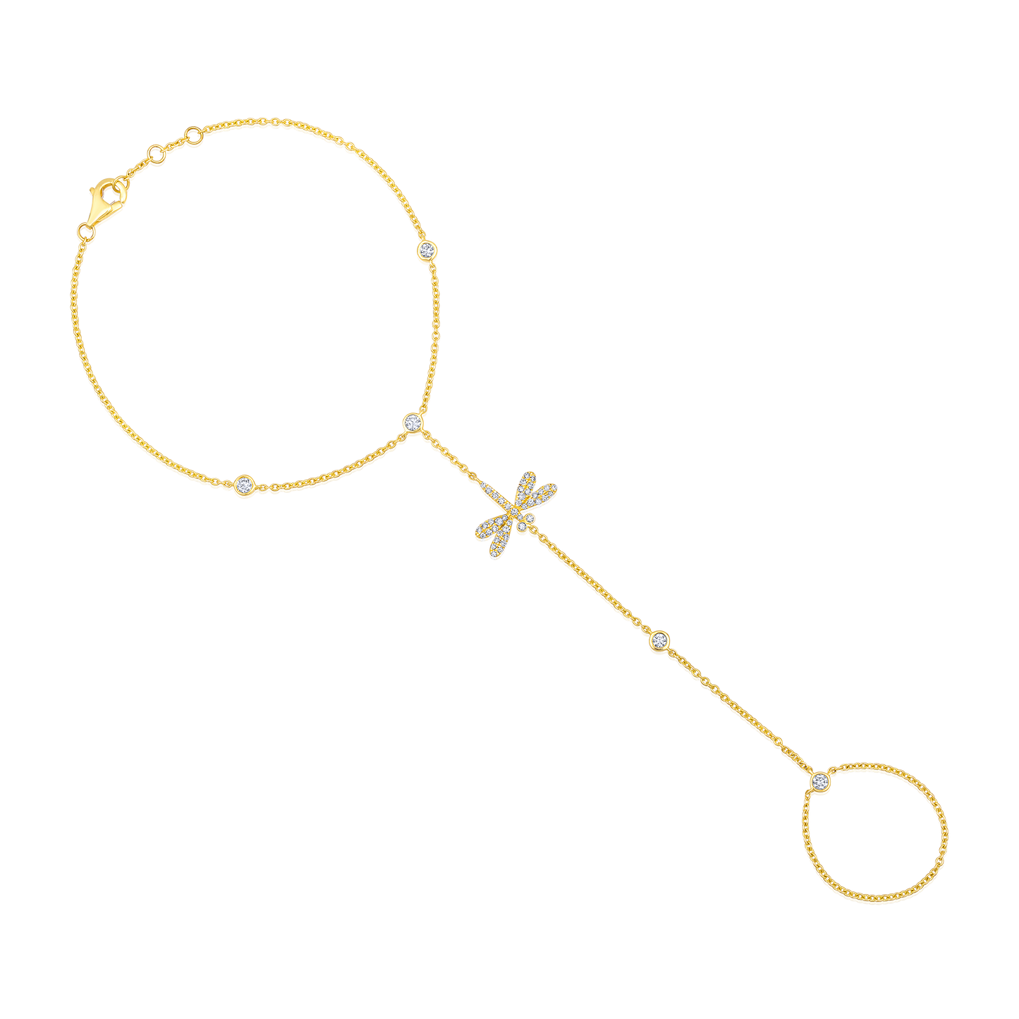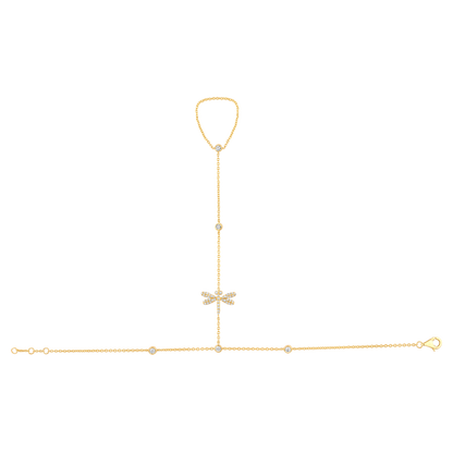 Add a touch of elegance with this 14k Yellow Gold Diamond Bee Hand Chain. The delicate bee design is beautifully complemented by five diamond bezel set, giving a total diamond weight of 0.39 CRT. A perfect piece for any occasion, it adds a spark of luxury and beauty to your hand.