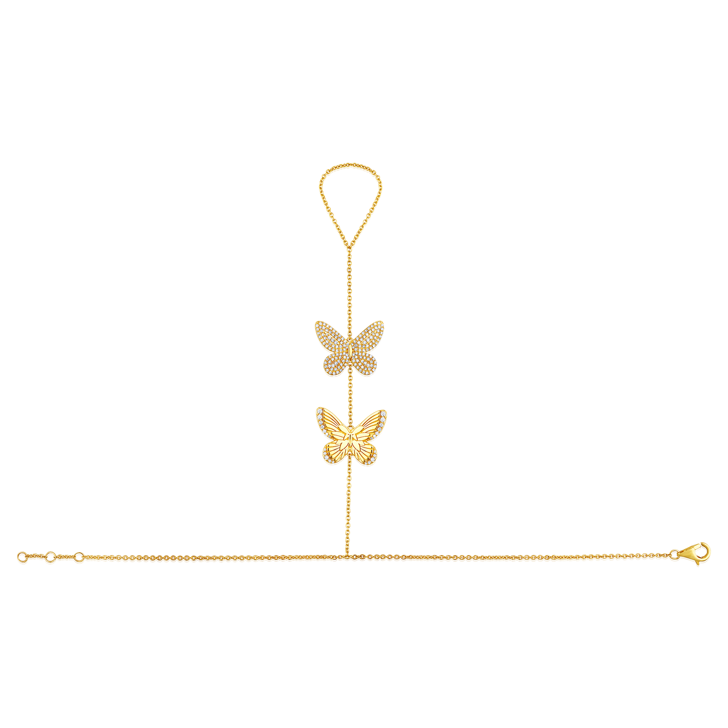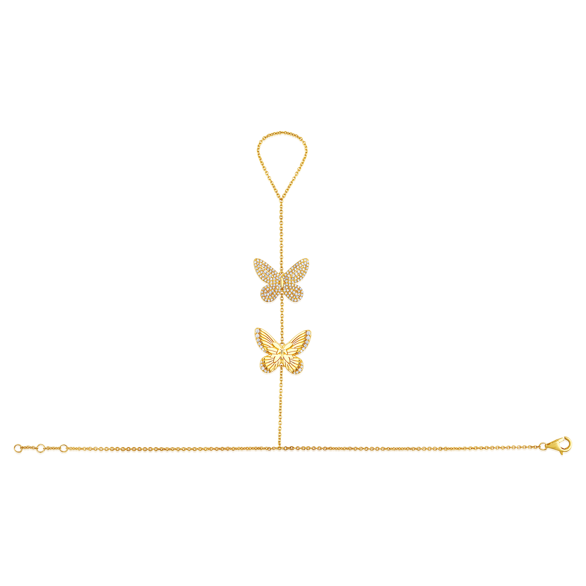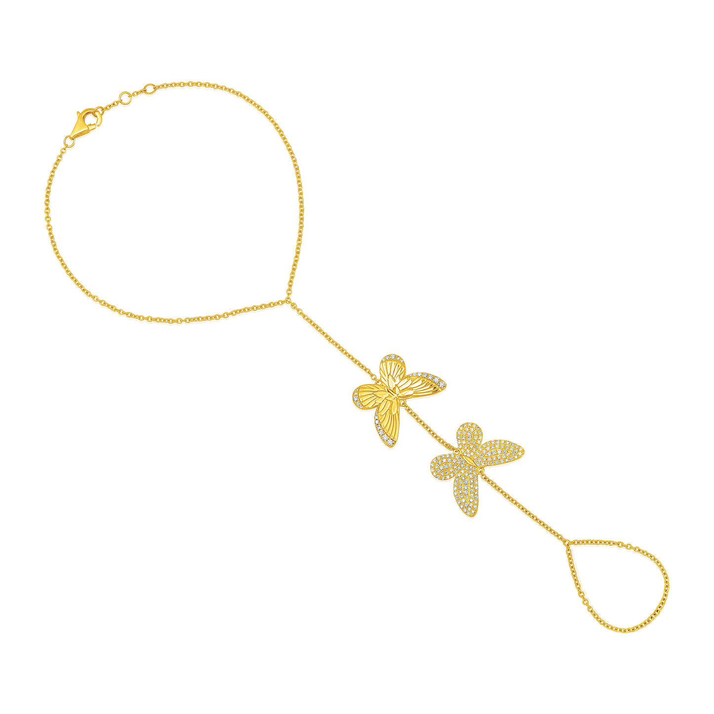 14k Yellow Gold Diamond Butterfly Hand Chain with 0.57 crt of round brilliant cut diamonds gracing two delicate butterfly charms