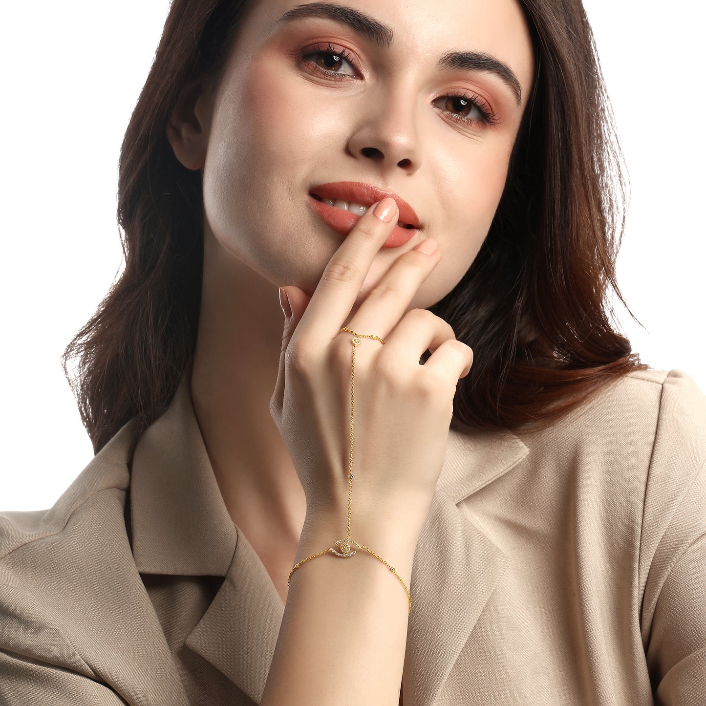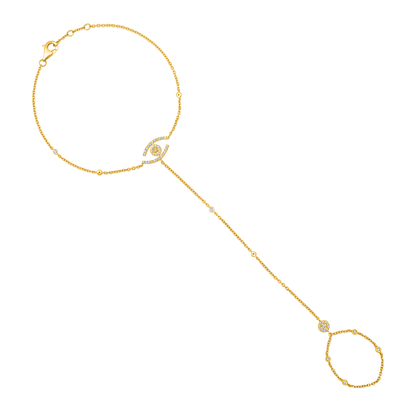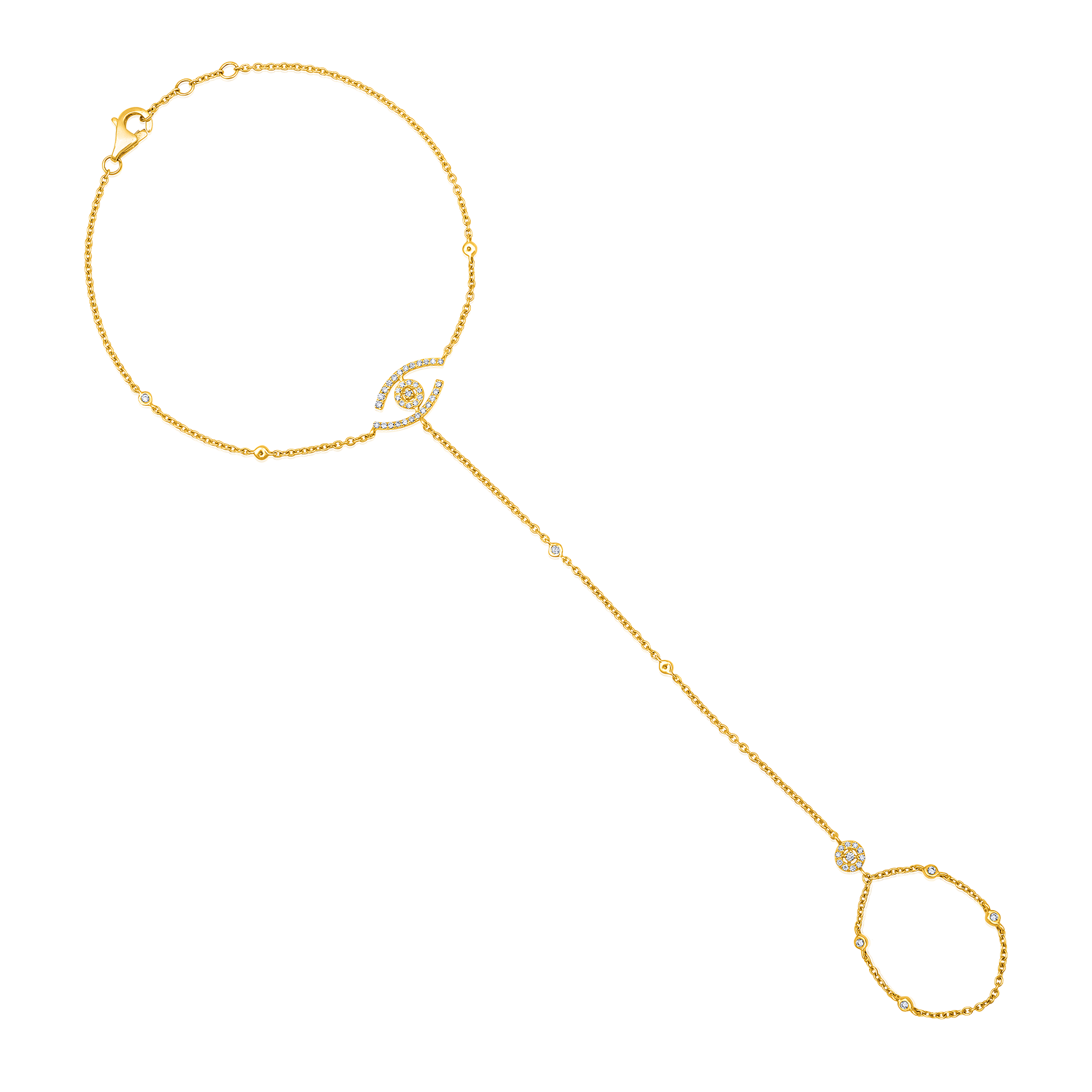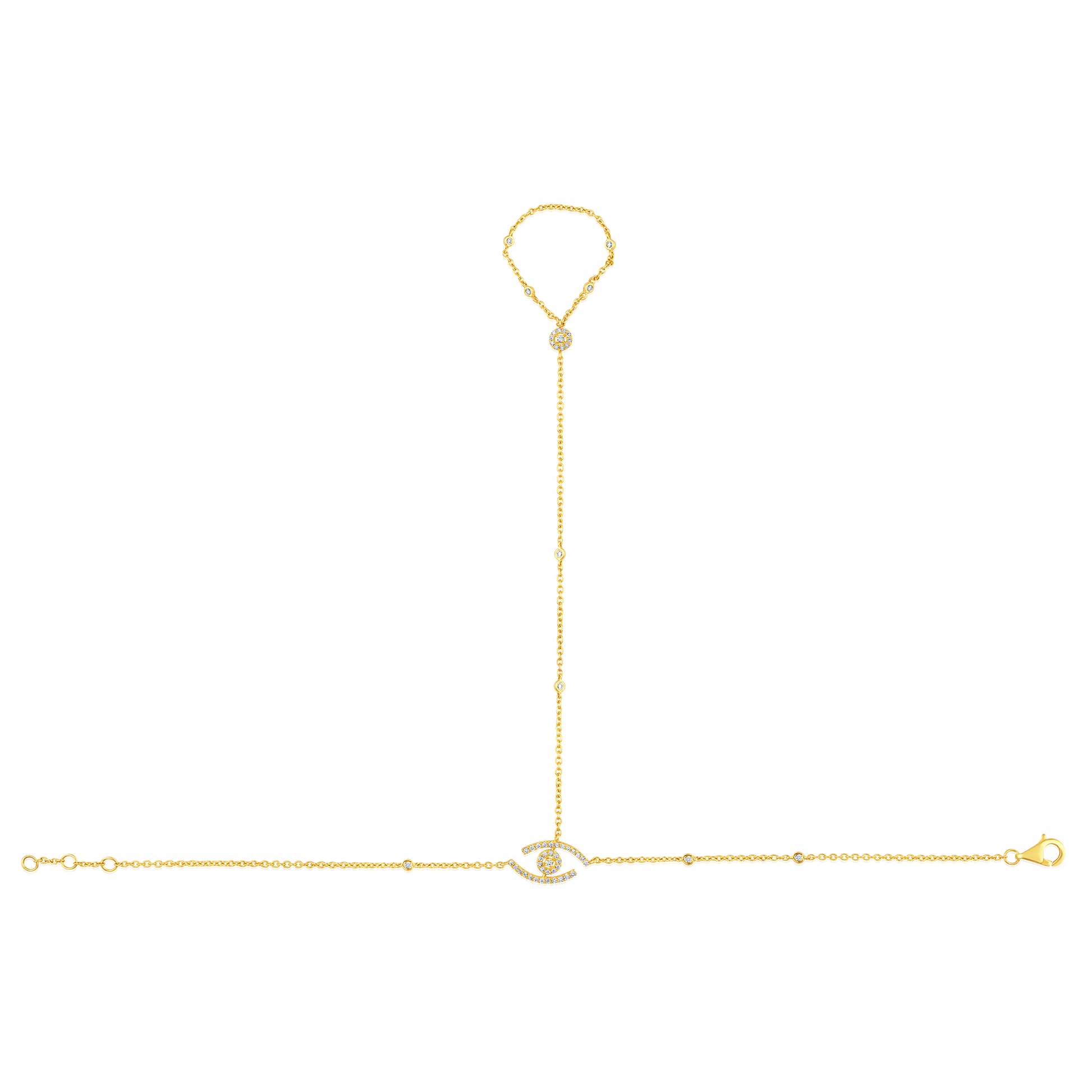 Discover the stunning 14k Yellow Gold Diamond Evil Eye Diamond Hand Chain, adorned with a total diamond weight of 0.25 CRT round brilliant cut diamonds.
