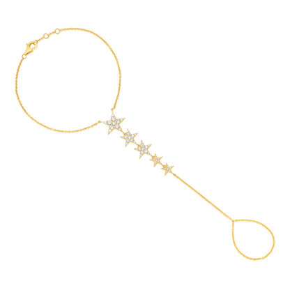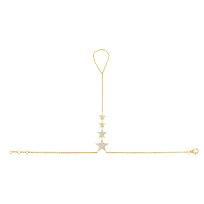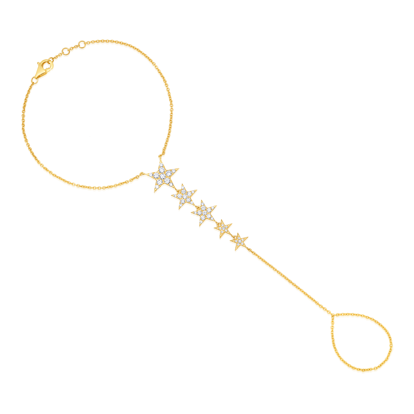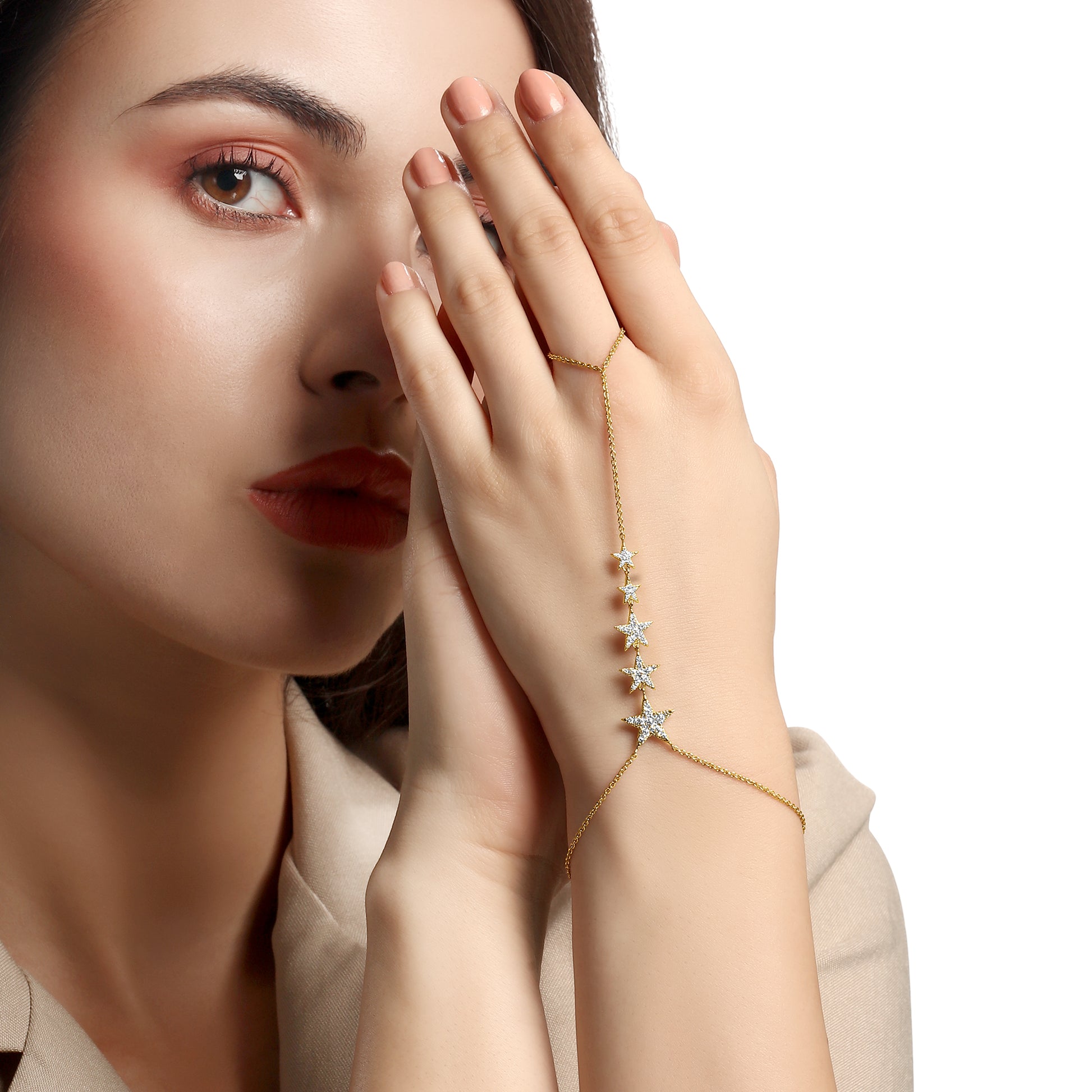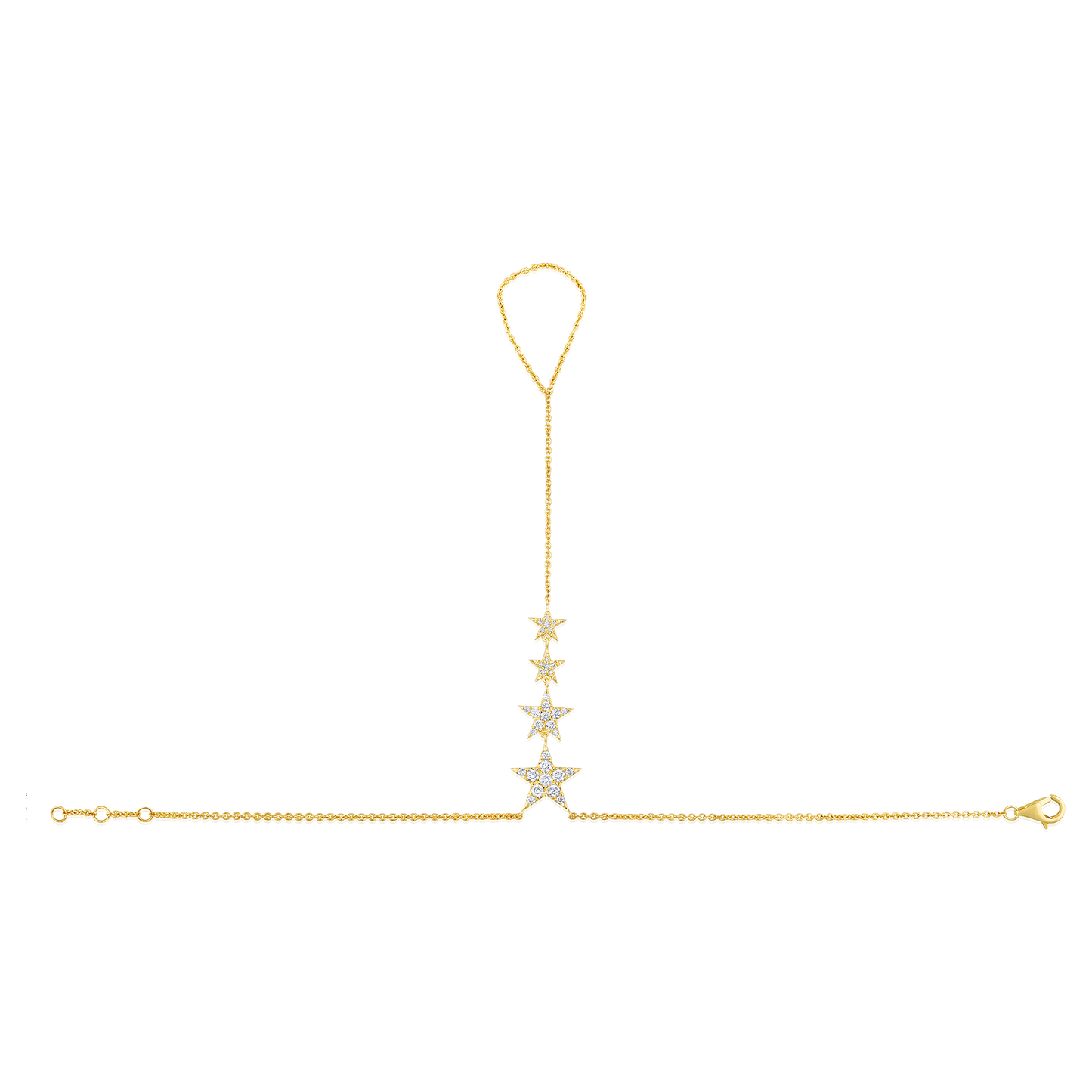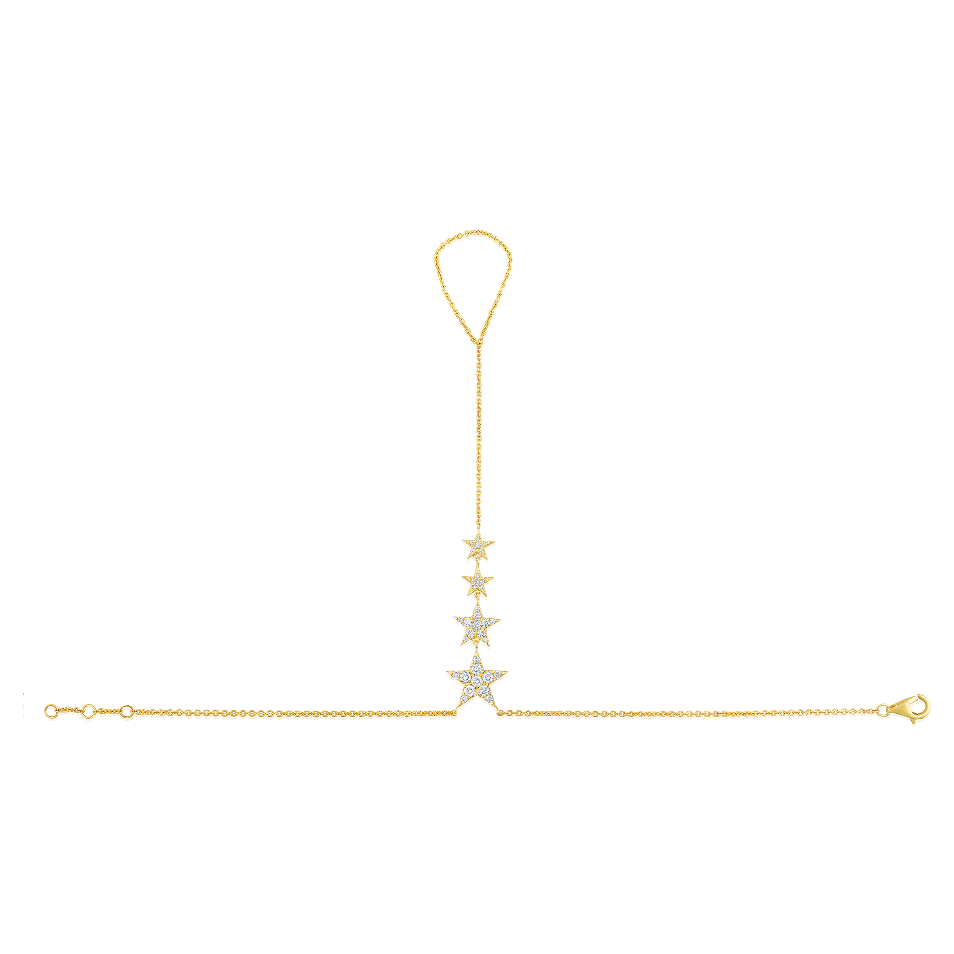 This stunning 14k Yellow Gold Diamond Stars Hand Chain is adorned with a total diamond weight of 0.83 crt, featuring sparkling round brilliant cut diamonds.