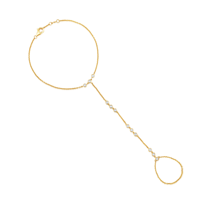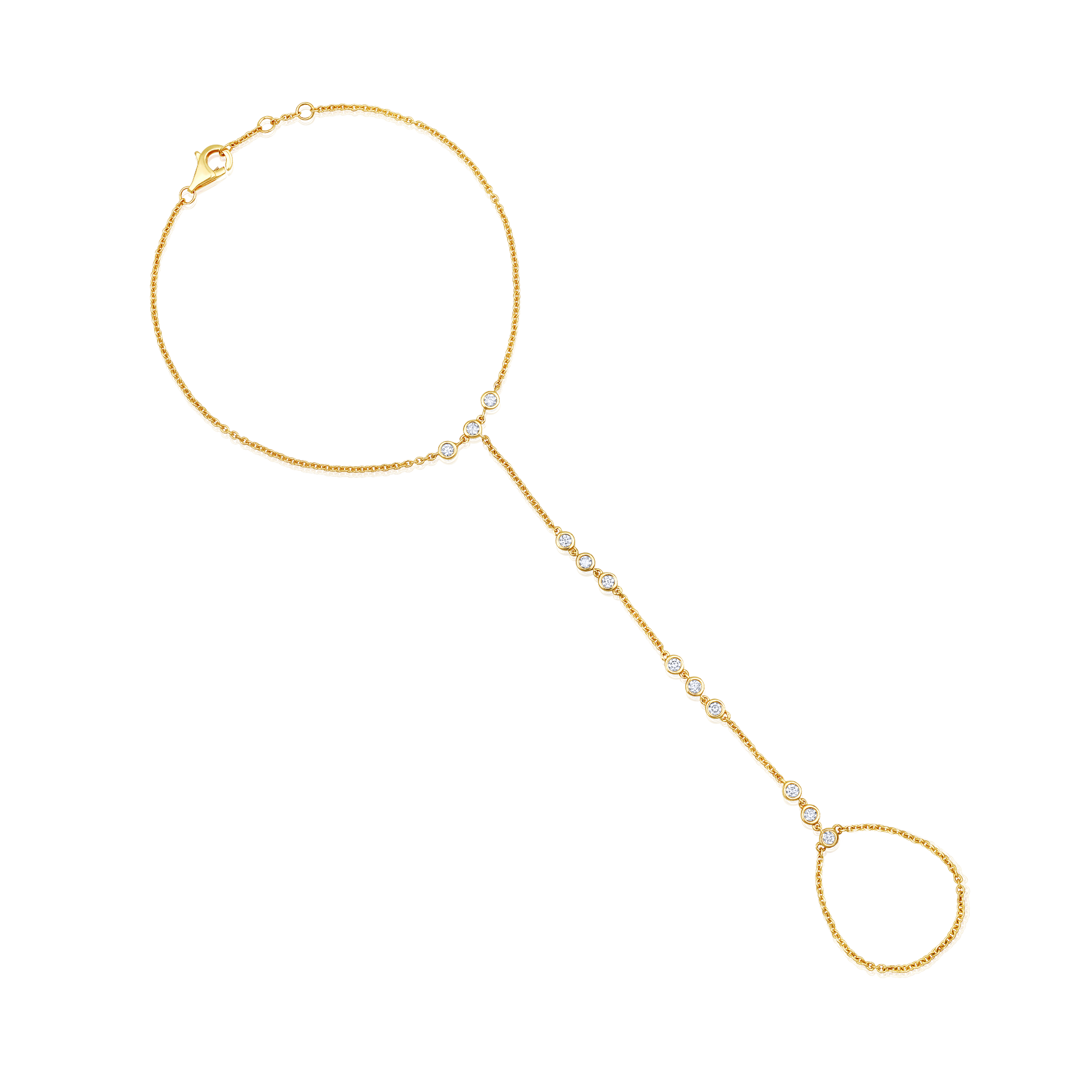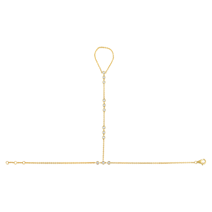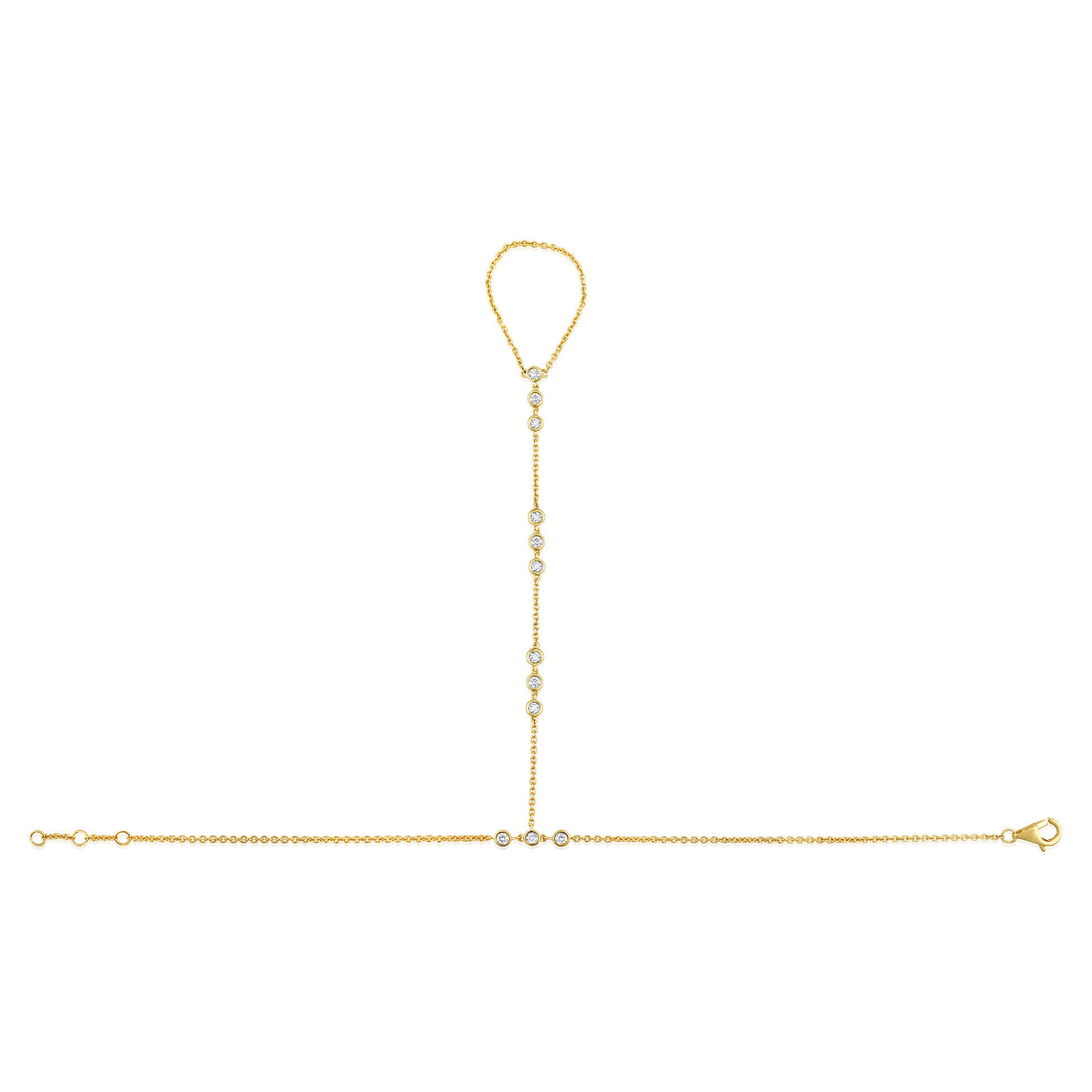 Indulge in luxury with our 14k Yellow Gold Hand Chain. Adorned with 12 round diamond bezel settings, totaling 0.39 CRT, this hand chain will add a touch of elegance and sparkle to any outfit. Elevate your style and feel confident with this truly stunning piece.
