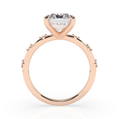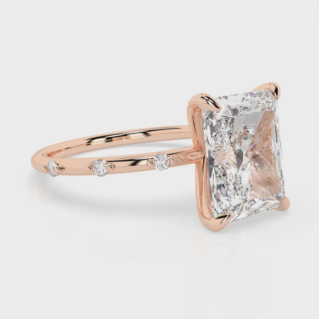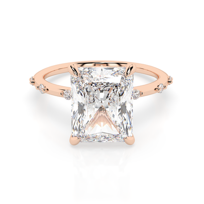Crafted from 14k rose gold, the Ava Setting features a stunning 3-carat radiant cut lab-grown diamond at its center, IGI certified with E color and VVS-2 clarity. Surrounded by 0.8 carats of round cut diamonds on the sides in a classic prong setting, this ring beautifully highlights your diamond’s brilliance while exuding timeless elegance. Perfect for expressing love and commitment, the Ava Setting is a striking choice that captures attention with its refined craftsmanship.