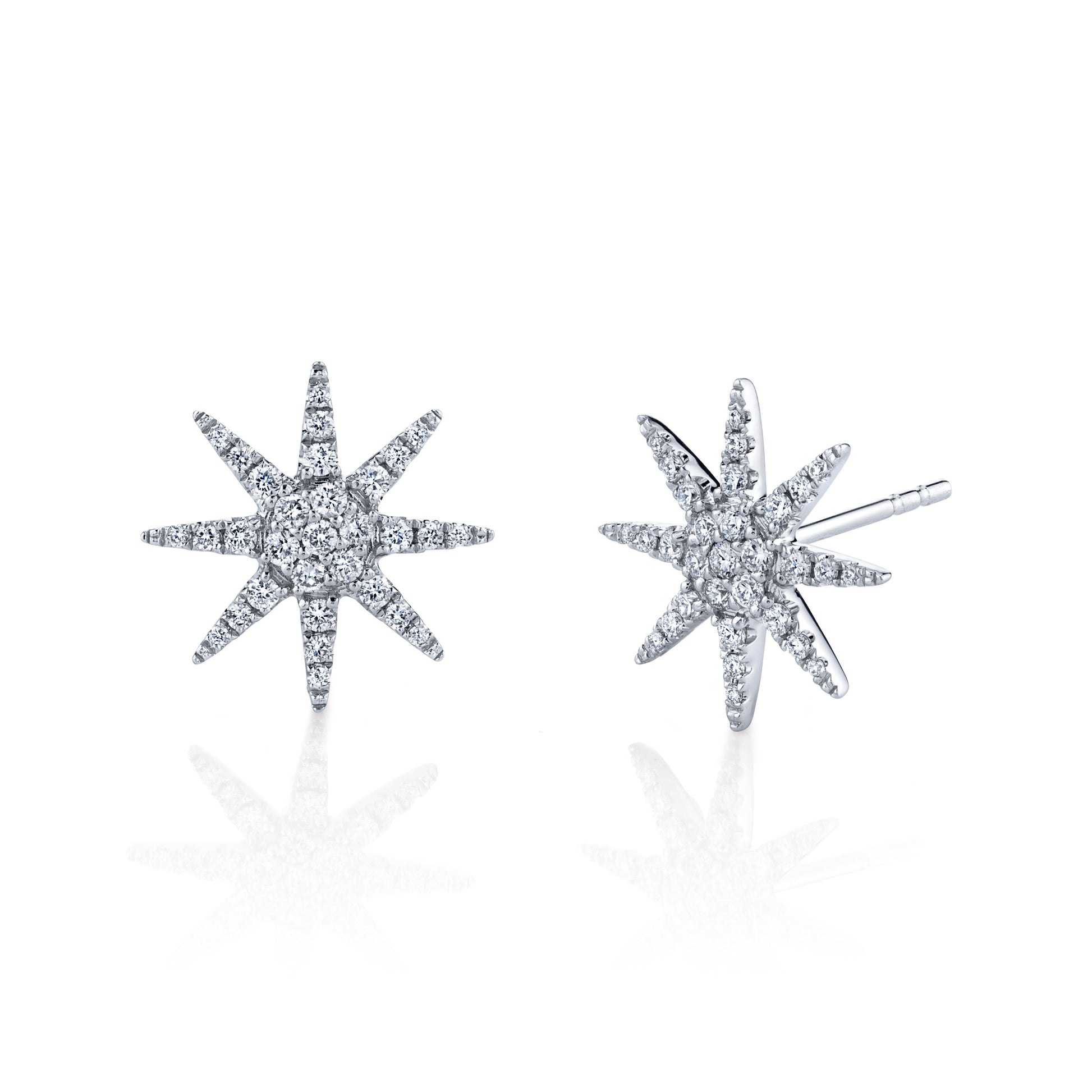 Elevate your elegance with these 14k white gold starburst cluster diamond studs, featuring a dazzling total of approximately 0.30 carats in round brilliant diamonds. Perfect for adding a radiant sparkle to any outfit.