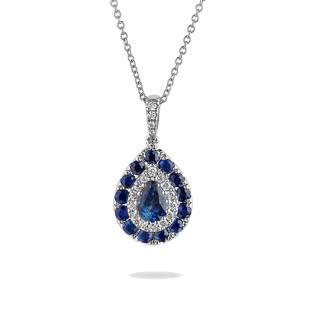 Elevate your elegance with this 14k White Gold Double Halo Pear Shape Sapphire Pendant, featuring a stunning 1.09 ct sapphire surrounded by approximately 0.14 ct of sparkling diamonds. This exquisite piece captures timeless beauty and brilliance, perfect for adding a touch of sophistication to any outfit.