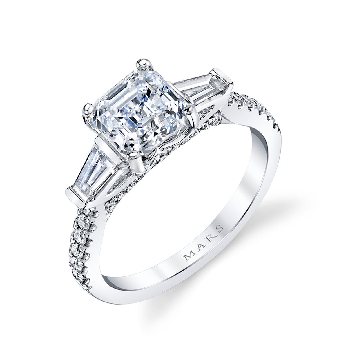 This stunning Mars Asscher Engagement Ring, crafted from 14K White Gold, is adorned with a dazzling combination of round cut diamonds and baguettes totaling 0.54 carats on the band.