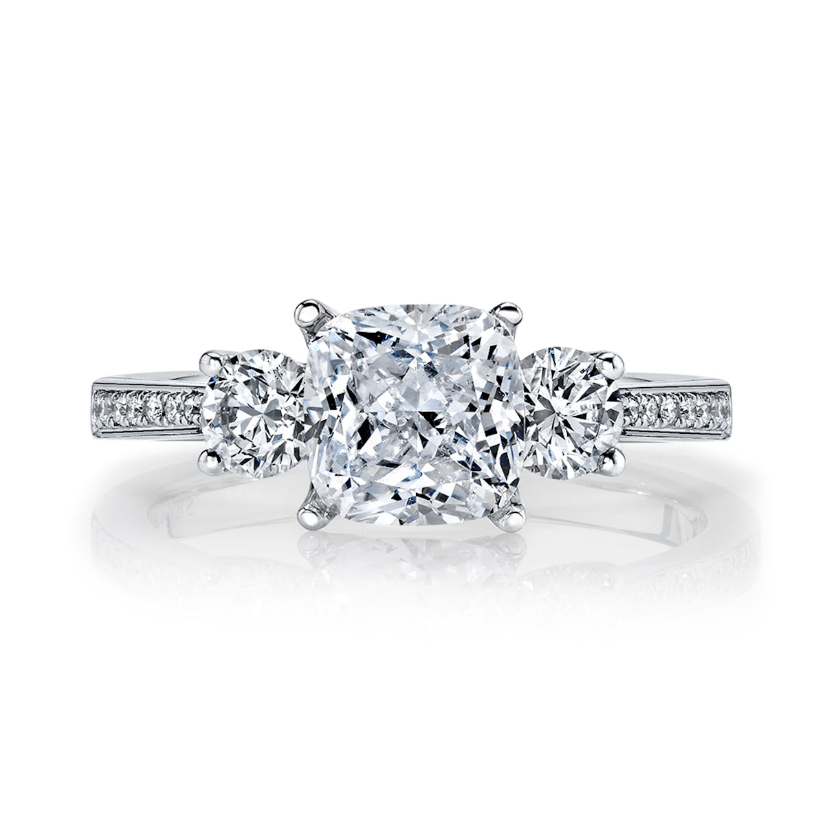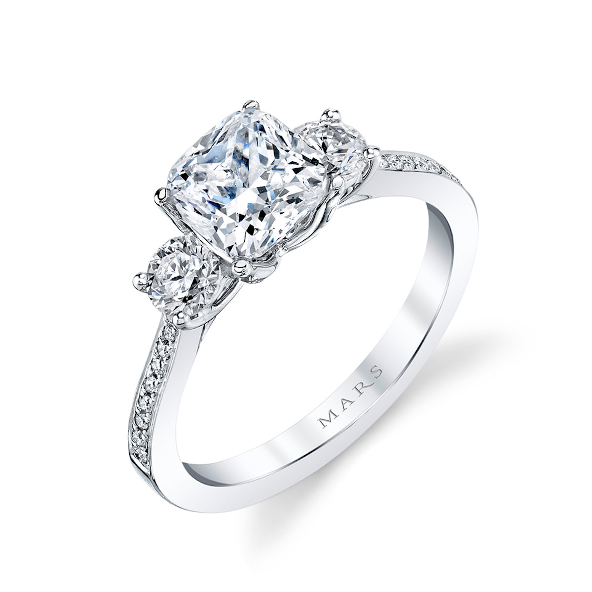 Immerse yourself in luxury with our Mars Cushion Engagement Ring in 14K White Gold. Adorned with a total of 0.60 carats on the sides, this ring's breathtaking 3 stone design will captivate and mesmerize. Elevate your love with this exclusive and exquisite piece.