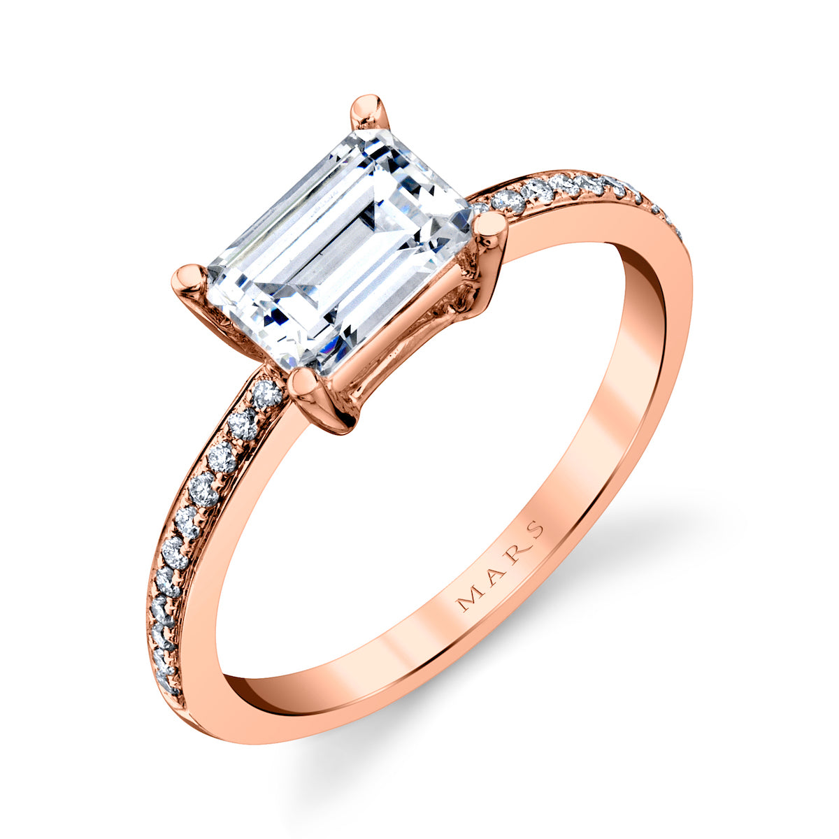 This exquisite 14K Rose Gold Mars Emerald Engagement Ring boasts a breathtaking emerald cut center diamond set in an east-west style, surrounded by 0.12 carats of shimmering round cut diamonds on the sides. The epitome of elegance and luxury.