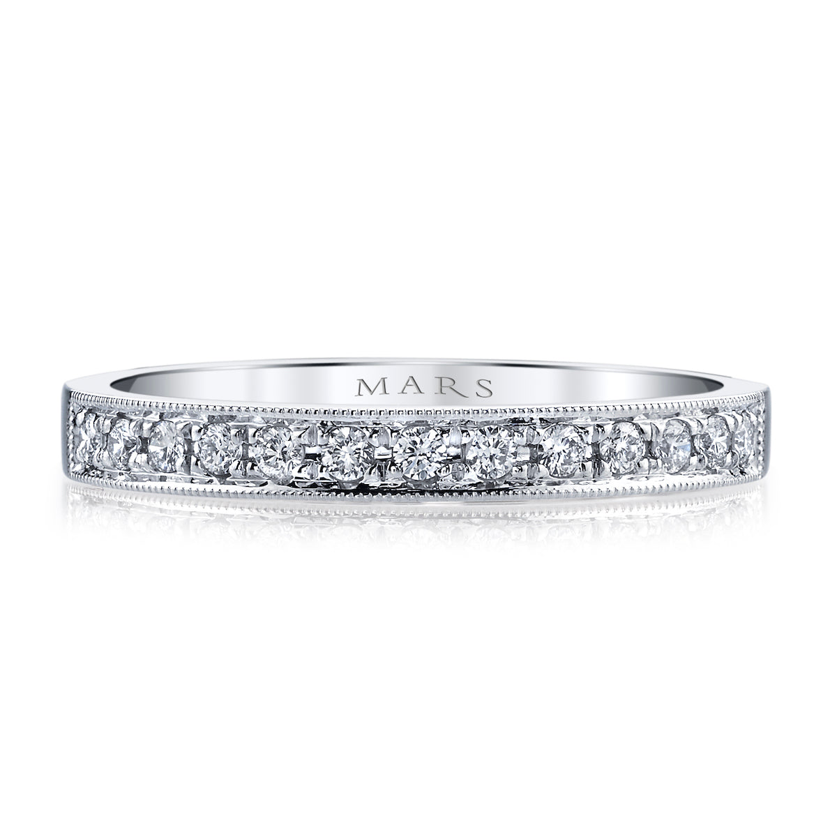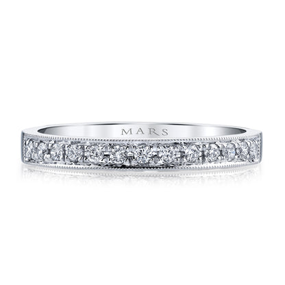 Capture your partner's heart with the dazzling Mars Matching Wedding Band. Crafted in 14K White Gold and adorned with sparkling 0.16 crt round diamonds in a prong setting, this band features a delicate milgrain edging that adds a touch of vintage charm to the modern Mars engagement ring style #26293.