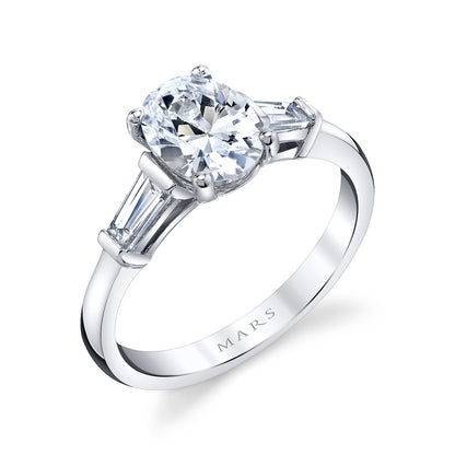 Experience the luxurious beauty of the Mars Oval Engagement Ring in 14K White Gold. This stunning ring features a dazzling 0.36 crts of tapered baguettes on the sides, accentuating the 3 stone style setting. Elevate your love and commitment with this exquisite ring.