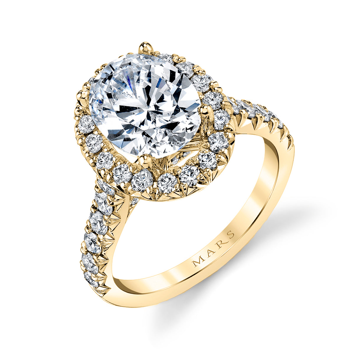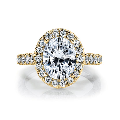 Experience the stunning elegance of this 14K yellow gold ring, featuring a total diamond weight of 4 carats. The captivating center stone is a certified IGI lab-grown 3 carat oval diamond, surrounded by a mesmerizing halo design. Embellished with 1 carat of dazzling round cut diamonds in a secure prong setting, this designer ring exudes both luxury and style.