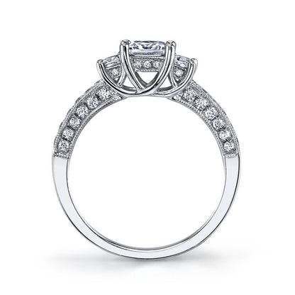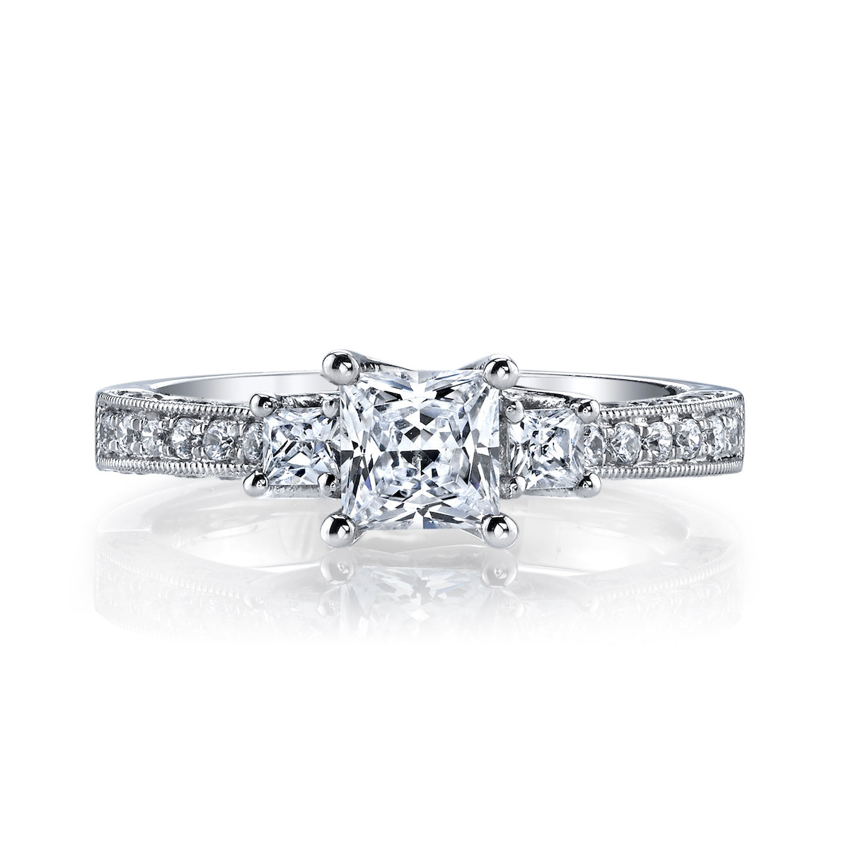 Experience the breathtaking beauty and exquisite design of the Mars Three-Stone Princess Engagement Ring. Made with 14K white gold and featuring approximately 0.59 carat side stones, this ring is the perfect symbol of your eternal love.