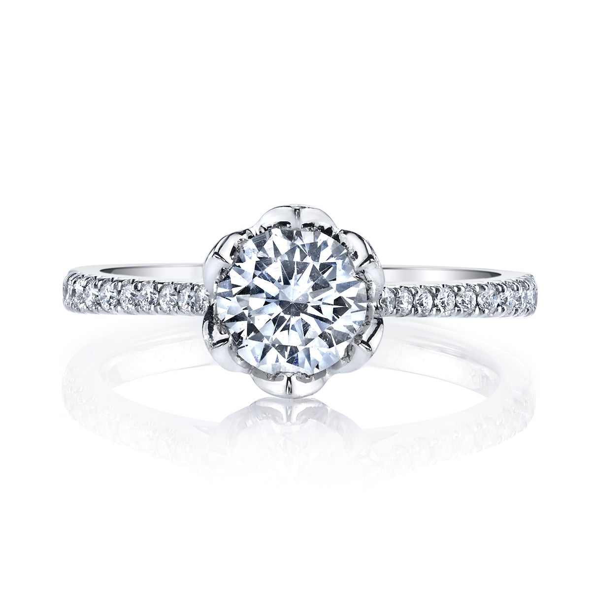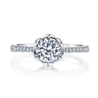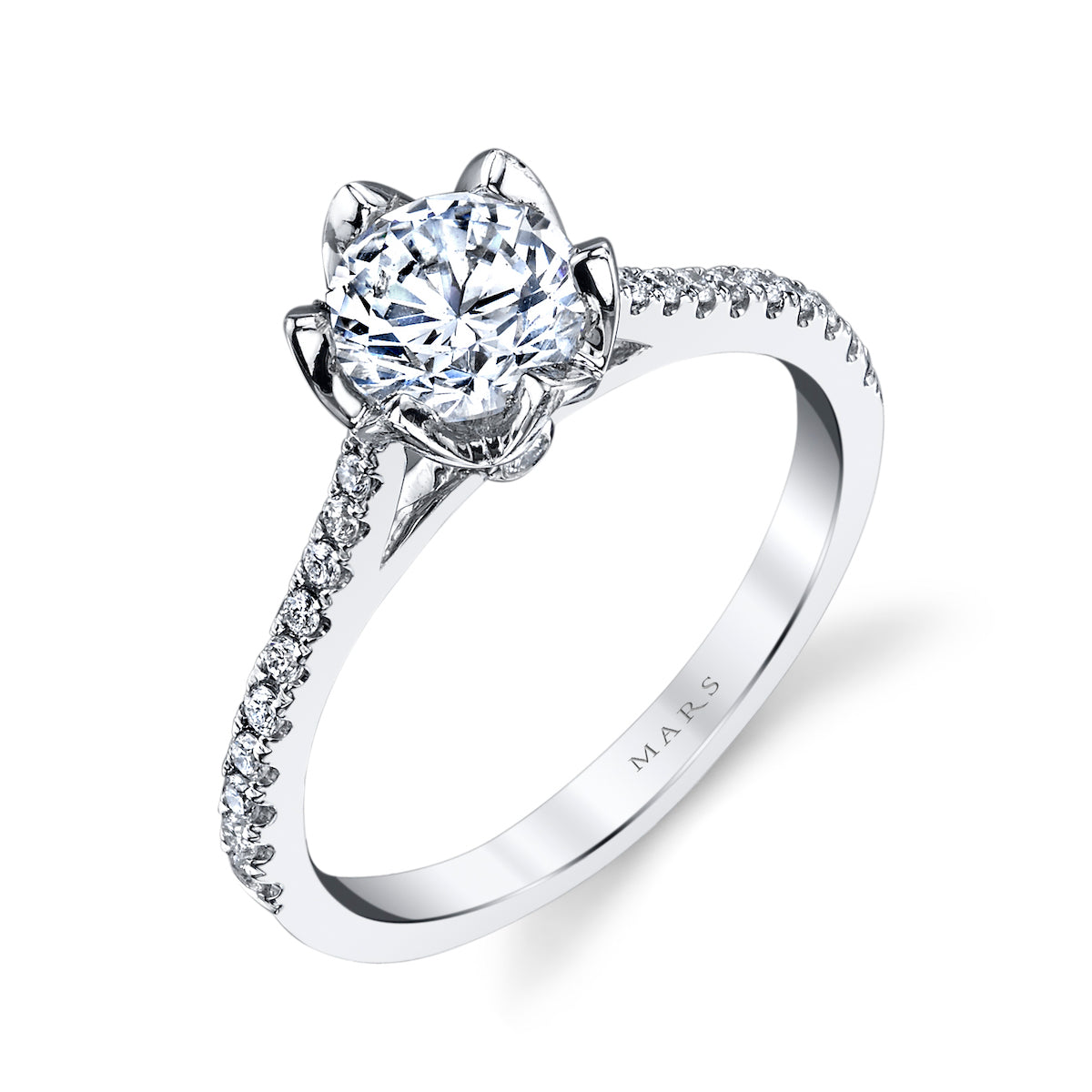 Channel your inner romantic and indulge in the breathtaking Mars Round Engagement Ring in 14K White Gold. This captivating piece features delicate side diamonds totaling 0.19 carats and a signature round cut diamond nestled beneath the crown.