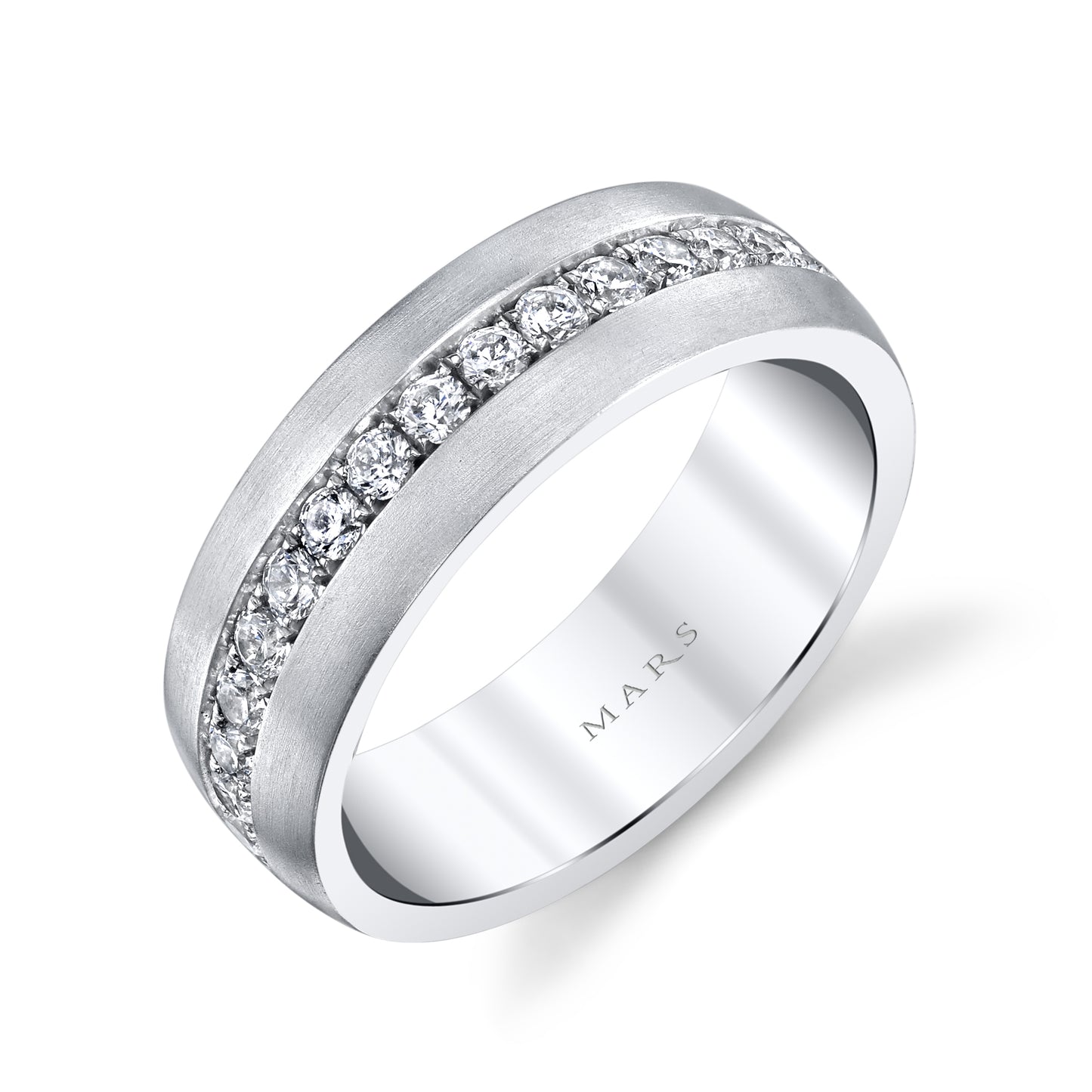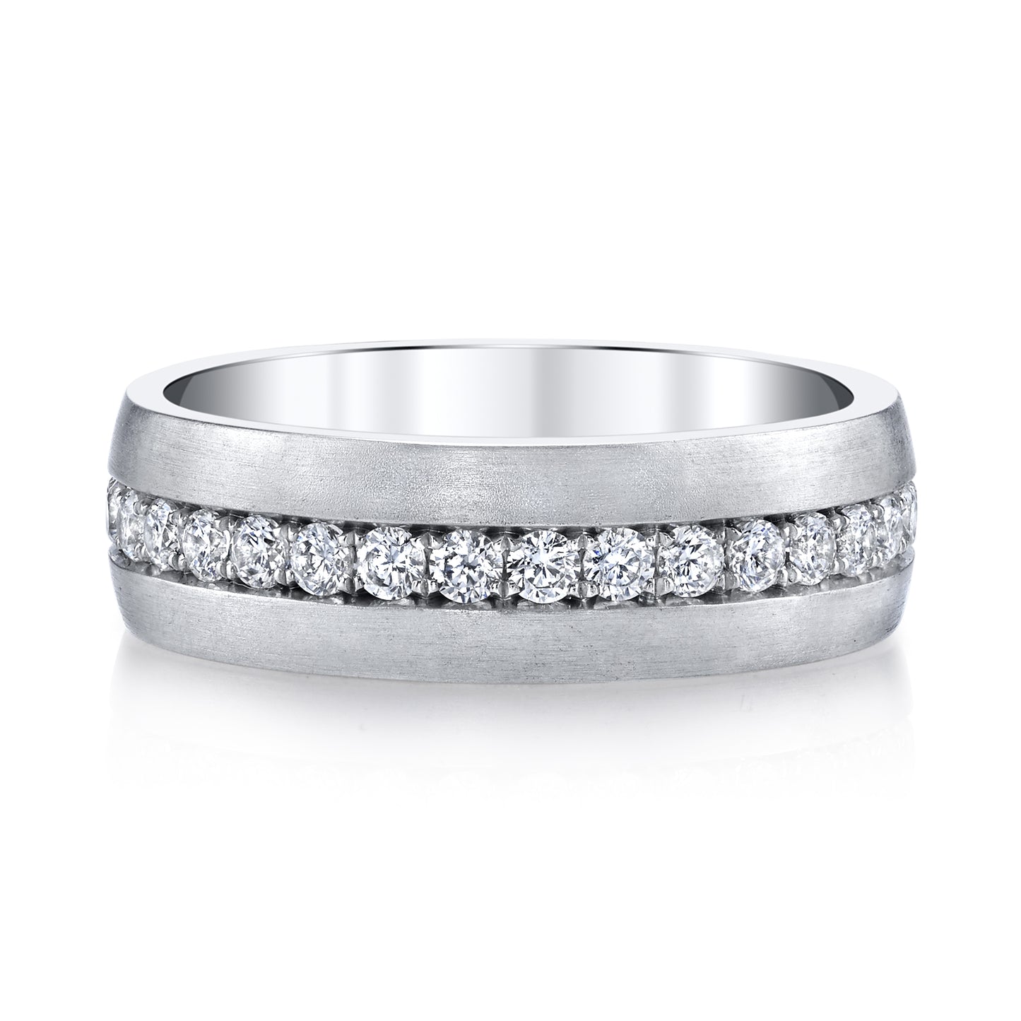 This 7mm men's wedding band features a smooth satin finish and is adorned with 2.00 carats of round natural diamonds. Choose from 14k yellow, white, or rose gold to perfectly match your style.
