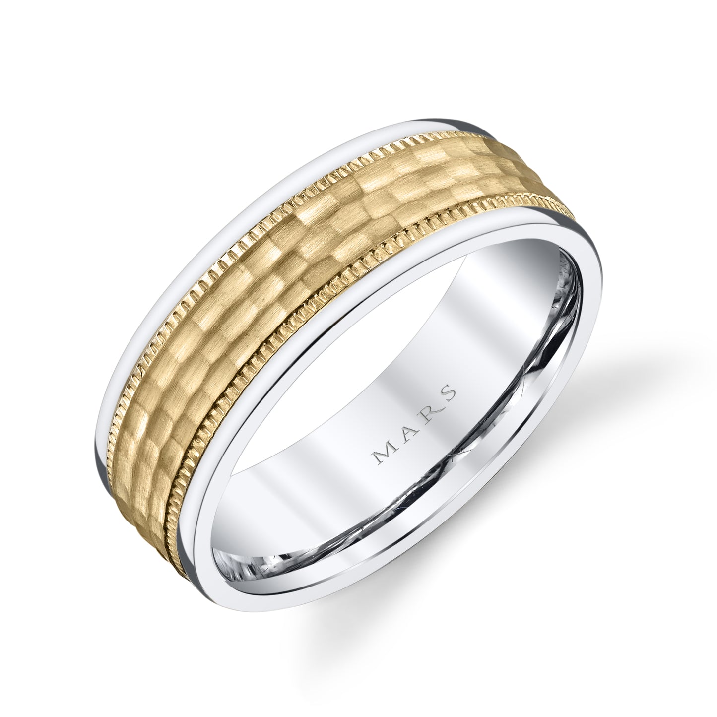 Elevate your love story with our Men's Two Tone 7mm Satin Hammer with Milgrain Edge Wedding Band - a celestial masterpiece. Crafted with precision, symbolizing the harmony of two souls intertwined. This timeless piece captures the essence of your bond, promising a future filled with love and joy.