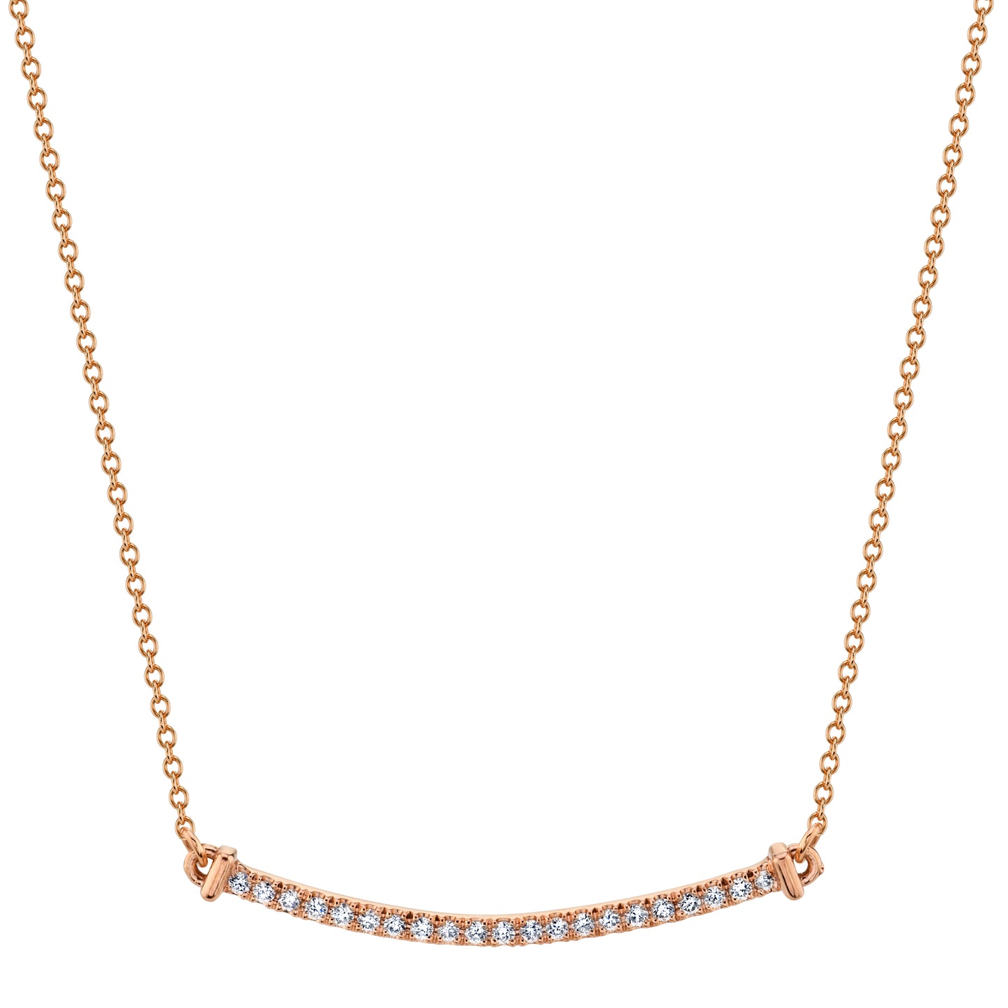 This elegant pendant features a curved bar design crafted in 14k rose gold, adorned with sparkling diamonds totaling around 0.12 carats, adding a subtle yet captivating shine to any outfit.