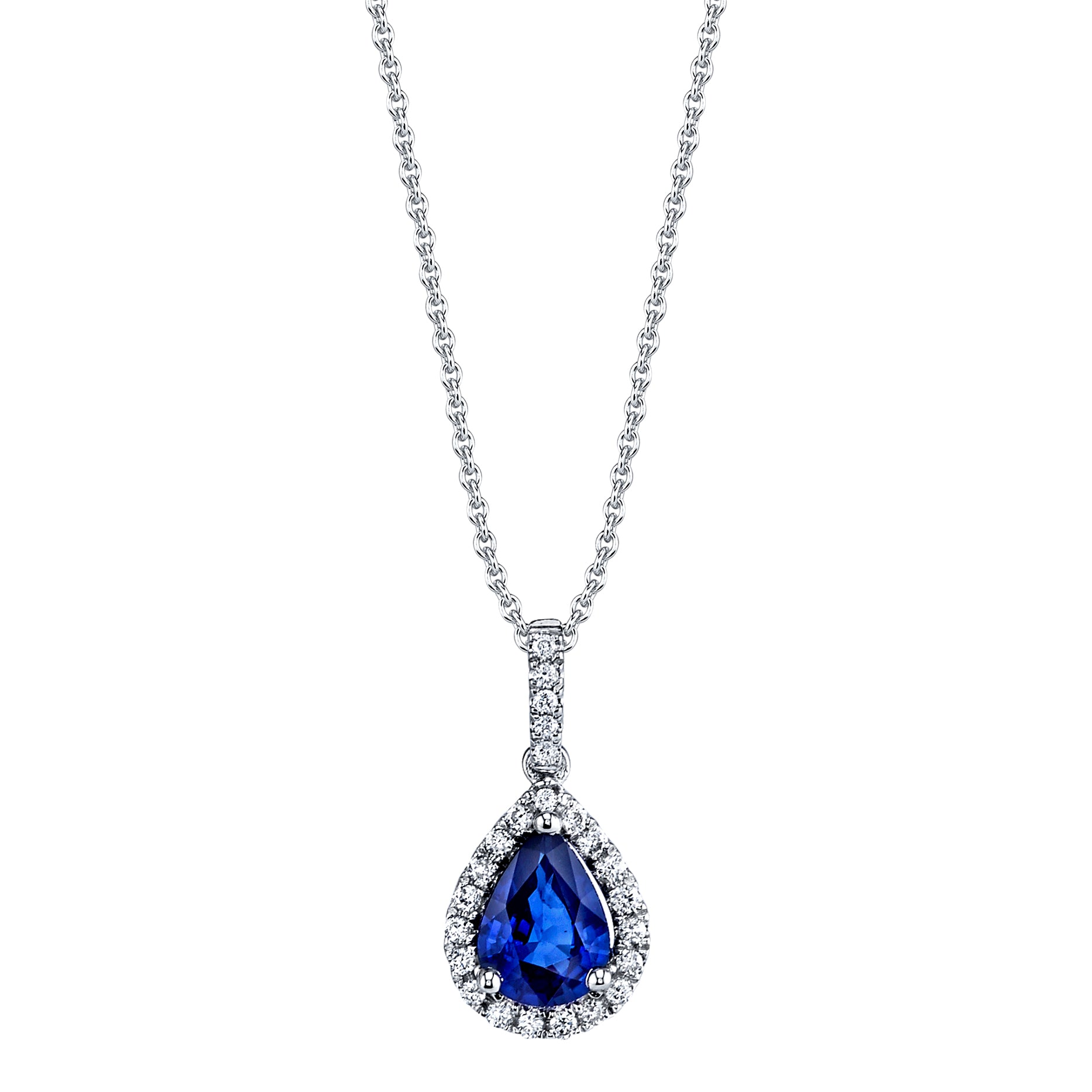 This elegant 14k White Gold pendant features a pear-shaped sapphire weighing 1 carat, surrounded by a sparkling halo of approximately 0.12 carats of diamonds, creating a stunning and timeless piece.