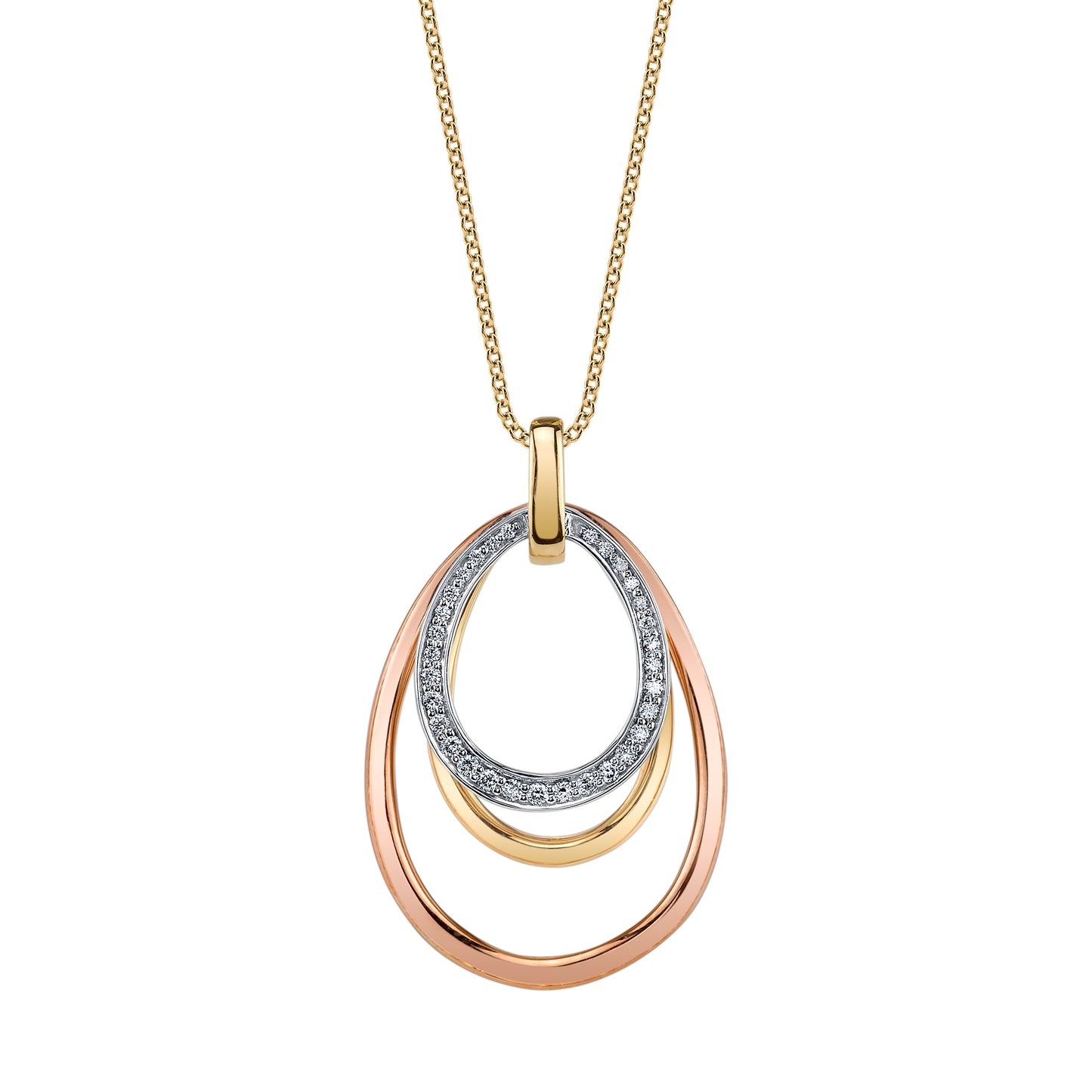 This 14k three-tone open drop pendant features a stunning arrangement of diamonds totaling 0.16 carats, adding a brilliant sparkle to its elegant design. Perfect for elevating any outfit with a touch of refined luxury.