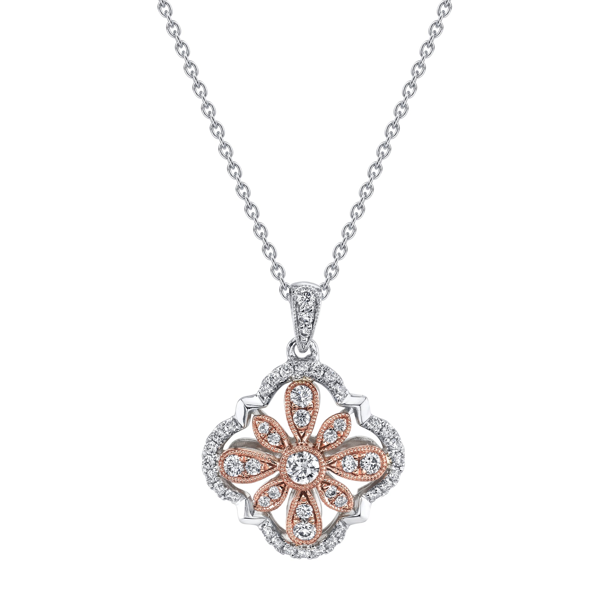 This 14k two-tone pendant features an intricate design adorned with approximately 0.40 carats of sparkling diamonds, making it a stunning addition to any jewelry collection.