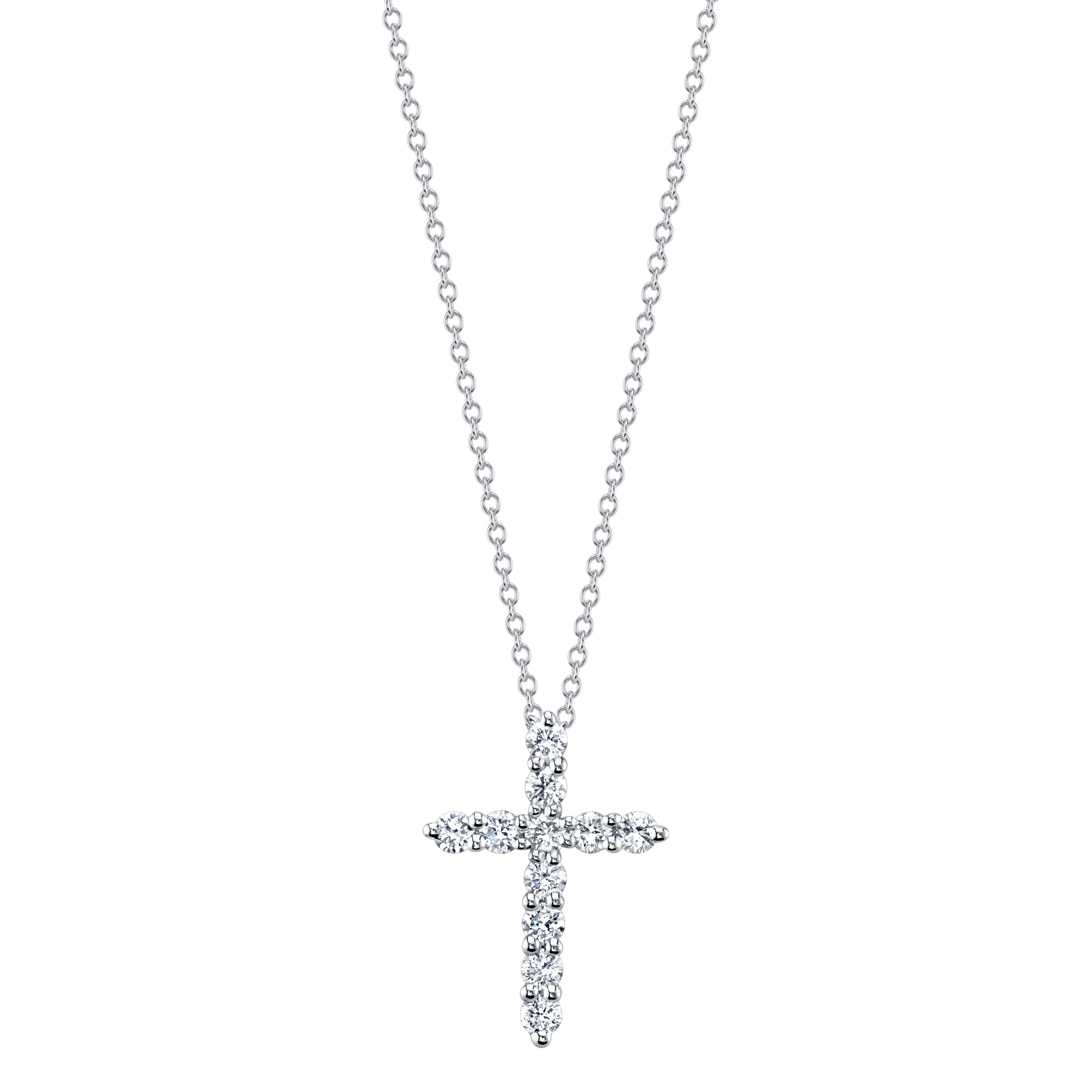This elegant cross pendant is crafted from 14k white gold and features round brilliant cut diamonds totaling approximately 0.25 carats, adding a subtle sparkle to your look.