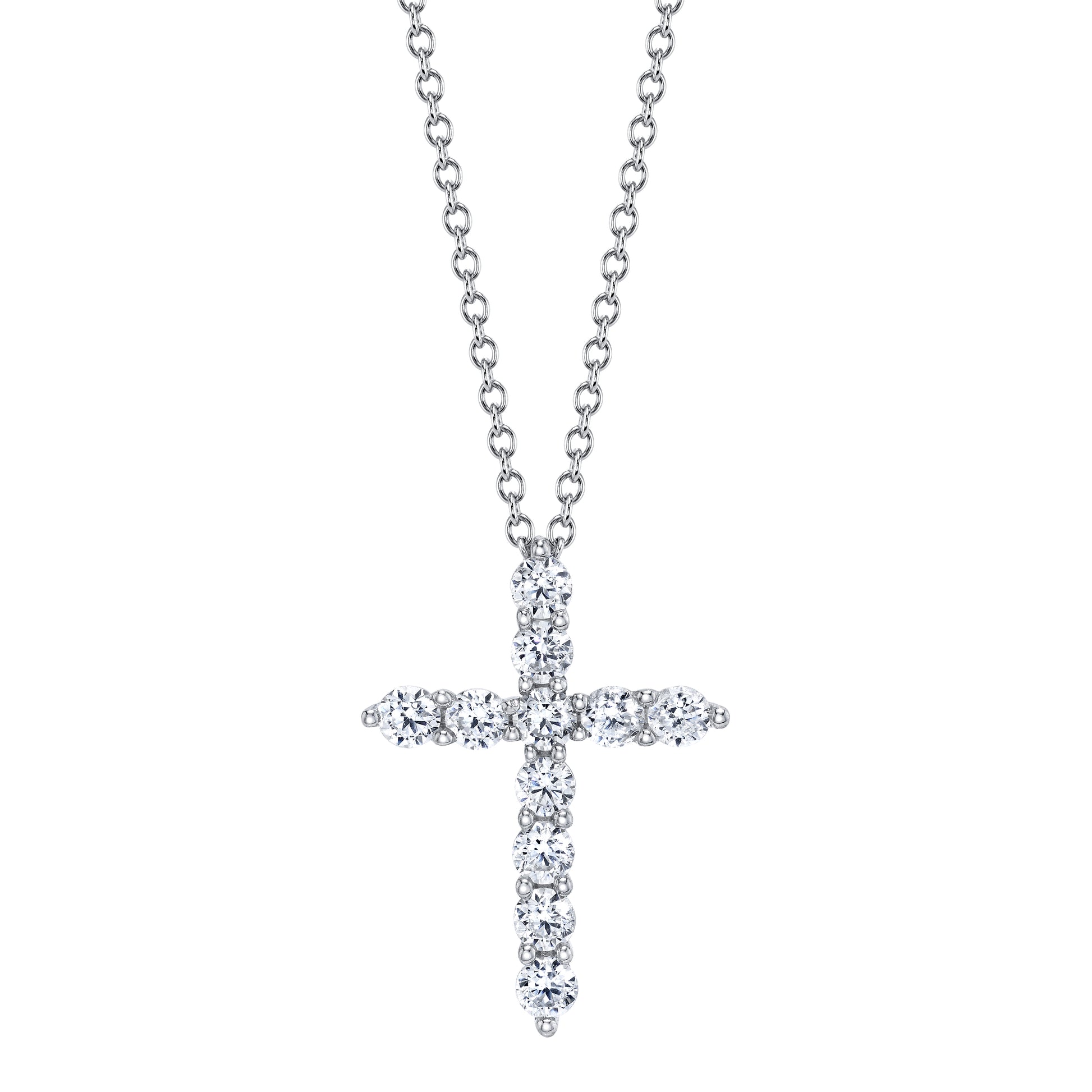 This 14k white gold cross pendant features approximately 0.48 carats of sparkling round brilliant cut diamonds, combining timeless elegance with radiant shine.