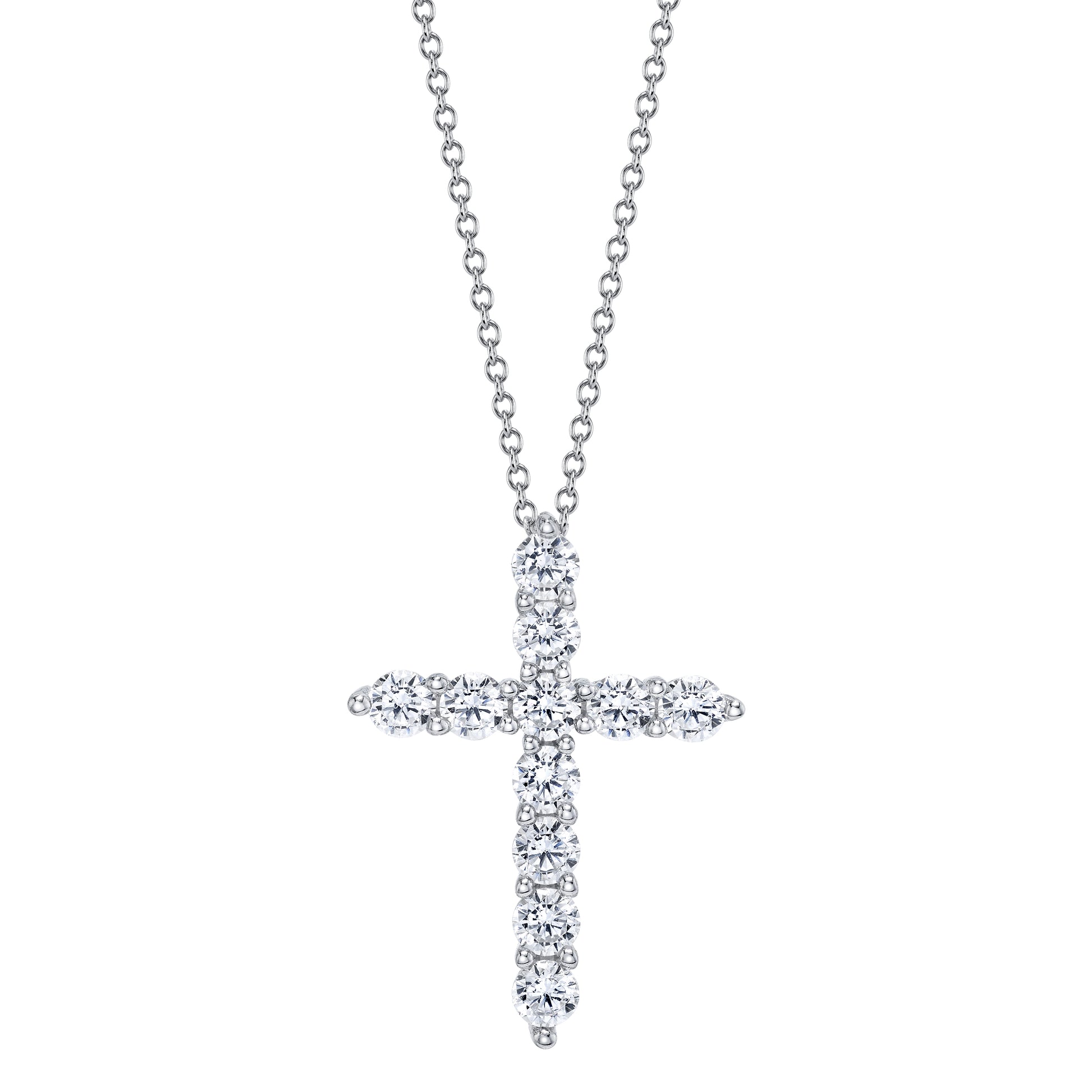 Crafted in 14k white gold, this cross pendant features around 0.72 carats of natural round brilliant cut diamonds, combining timeless elegance with sparkling brilliance.