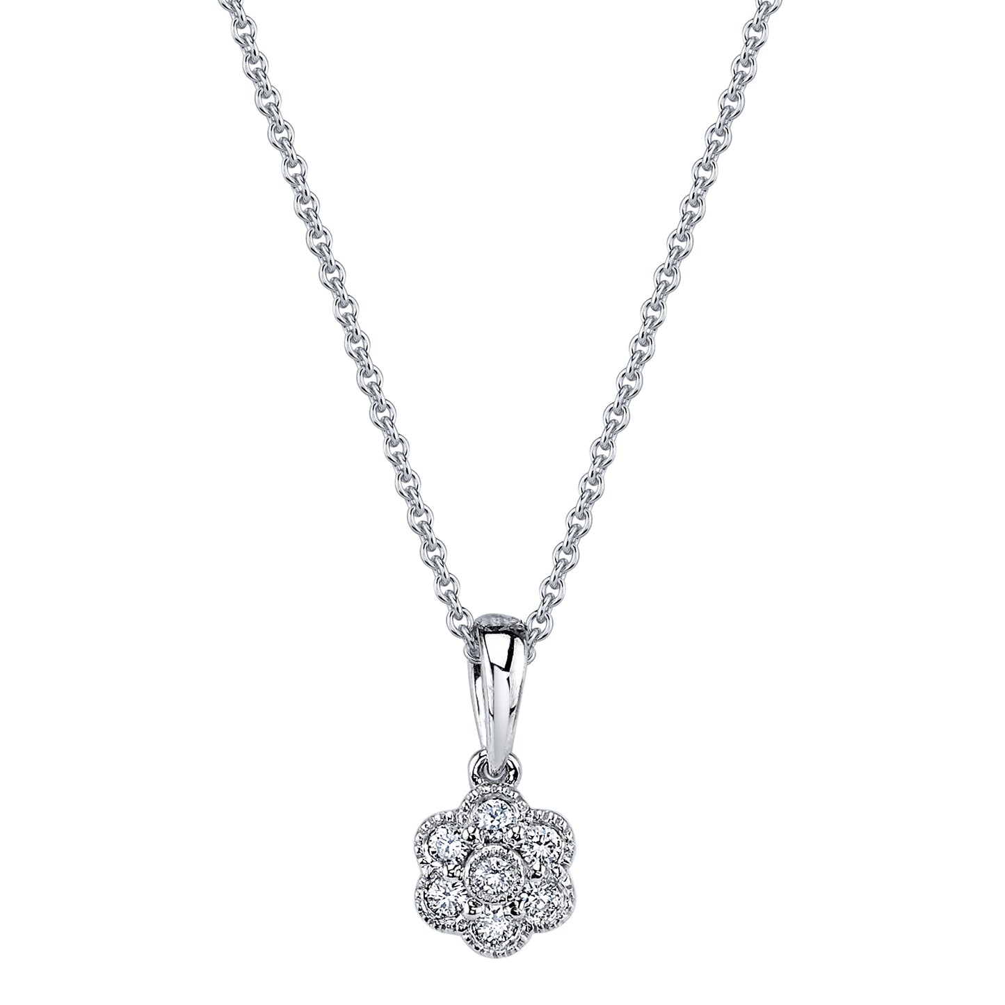 Elevate your elegance with this 14k white gold flower pendant, delicately adorned with approximately 0.10 carats of sparkling diamonds. Its refined design adds a touch of timeless beauty to any outfit, making it perfect for both everyday wear and special occasions. Experience the subtle brilliance and graceful charm that this pendant brings to your jewelry collection.