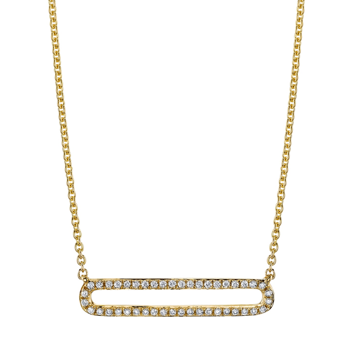This 14k yellow gold pendant features an open design adorned with approximately 0.15 carats of sparkling pave diamonds, adding elegant brilliance to any outfit.
